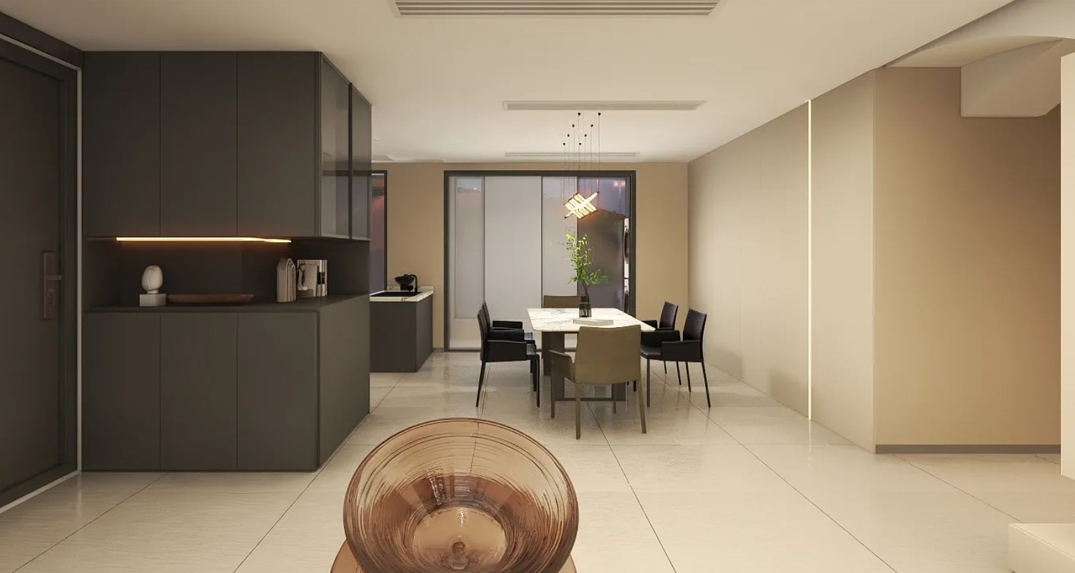 进门左手边是一个餐厨一体的空间。当下年轻人多以轻食为主,少了传统中餐油烟的困扰,所以偏好开放式厨房。本案中的业主,较少使用厨房,所以功能区的空间不大,水槽安置在中间,自然分隔出两个空间。门口的玄关柜,一体式地延伸到餐厅位置,增加了餐边柜的功能。