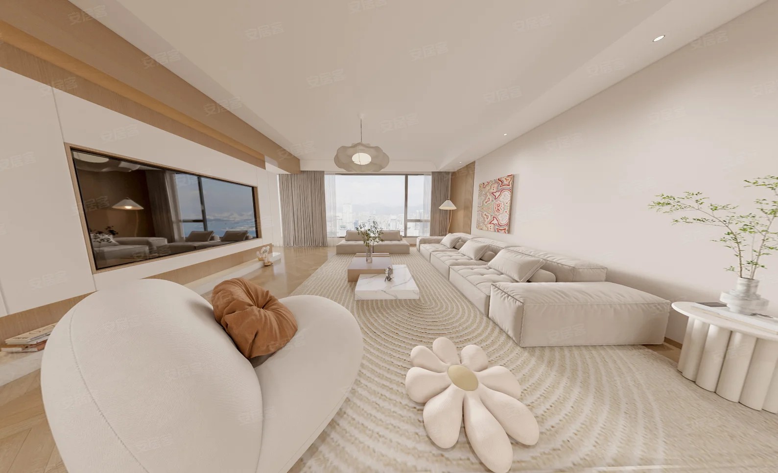 客厅以白色为主色调,搭配木质元素,营造温馨氛围。大面积落地窗引入充足光线,视野开阔。柔软的沙发、别致的抱枕与地毯增添舒适感,墙上挂画和绿植点缀,提升空间美感与生机,整体设计简洁大方又不失温馨