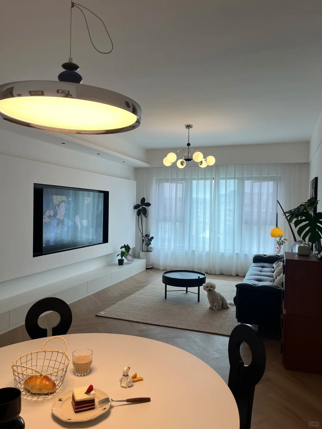 客厅面积较大,主卧室带有卫生间,合理规划收纳!一块嵌入墙面的大电视屏幕,电视下方是一个白色的长条柜子,与整个墙壁融为一体的设计非常和谐。房间内铺设了木地板,并配有米色地毯