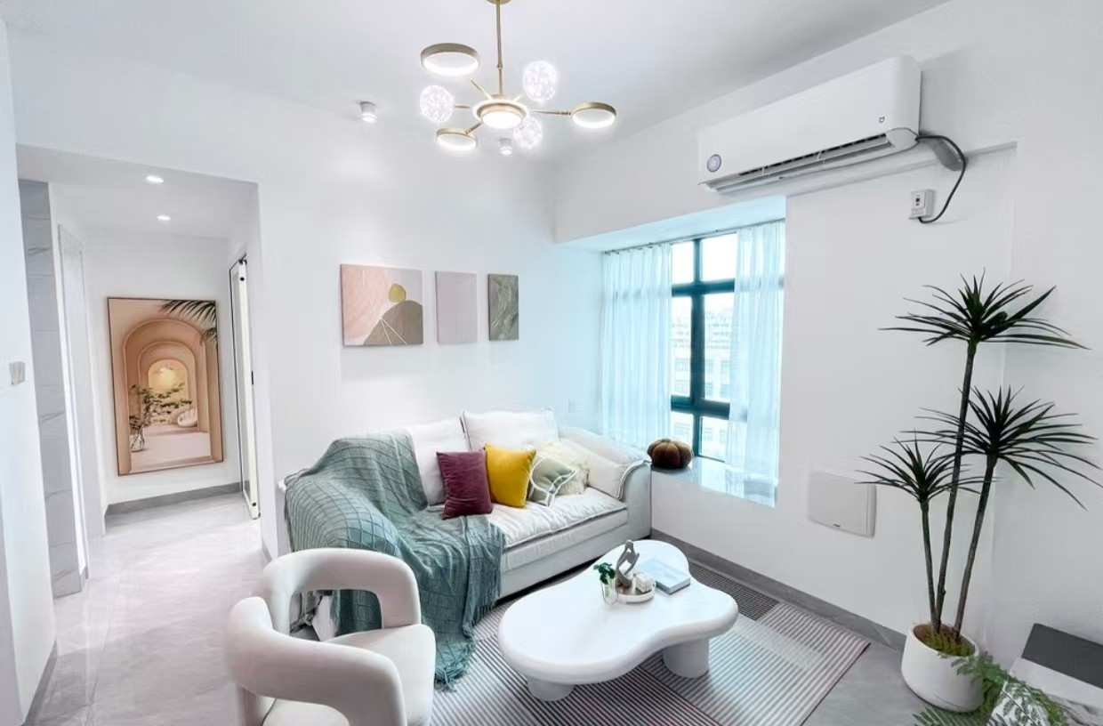 整体以白色为主色调,搭配柔和的灯光,营造出明亮宽敞的氛围。沙发上的彩色抱枕增添了活力,窗边的绿植带来生机,墙上的装饰画提升了艺术感,空调和吊灯等设施齐全,展现出舒适宜居的特点