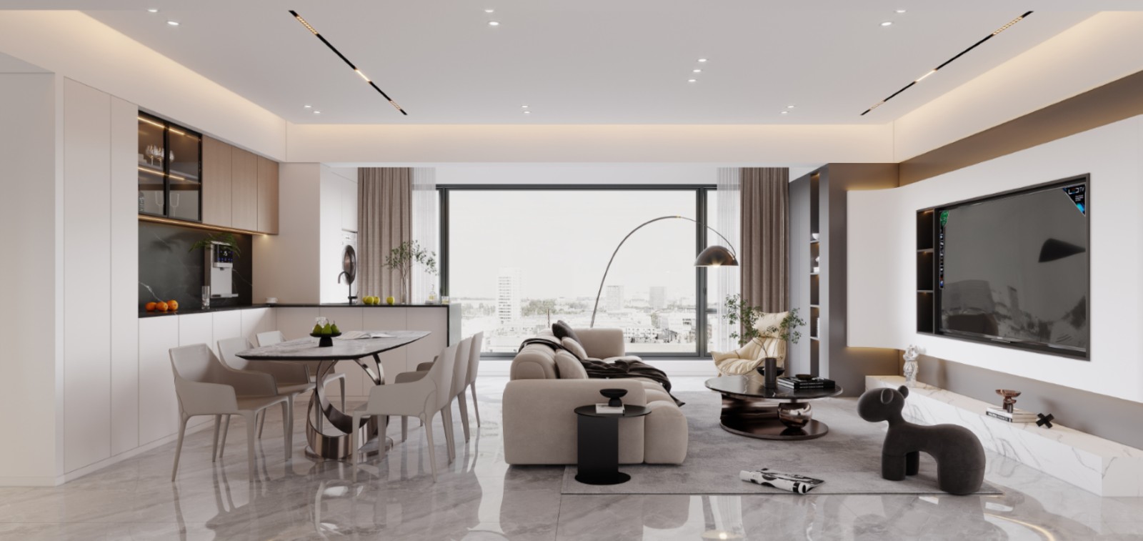 整体设计案例,包含客厅、卧室、厨房和书房等空间。整体色调以米色、灰色为主,搭配简约家具和柔和灯光,营造出温馨舒适的氛围。开放式厨房与客厅相连,增加空间通透感,卧室设计注重收纳与舒适,书房则兼具实用性与美观性