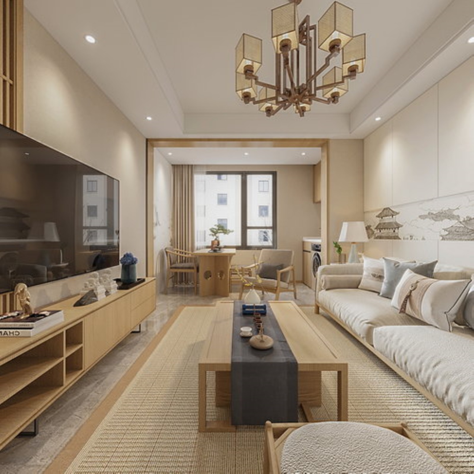 浅色系为主调,搭配木质家具,营造温馨氛围。吊灯造型独特,增添中式韵味。电视墙简洁大方,沙发舒适且抱枕配色和谐。茶几设计简约实用,地面铺设地毯提升质感。整体布局合理,动线流畅,采光良好,将中式元素与现代风格巧妙融合,打造出舒适宜居的客厅环境