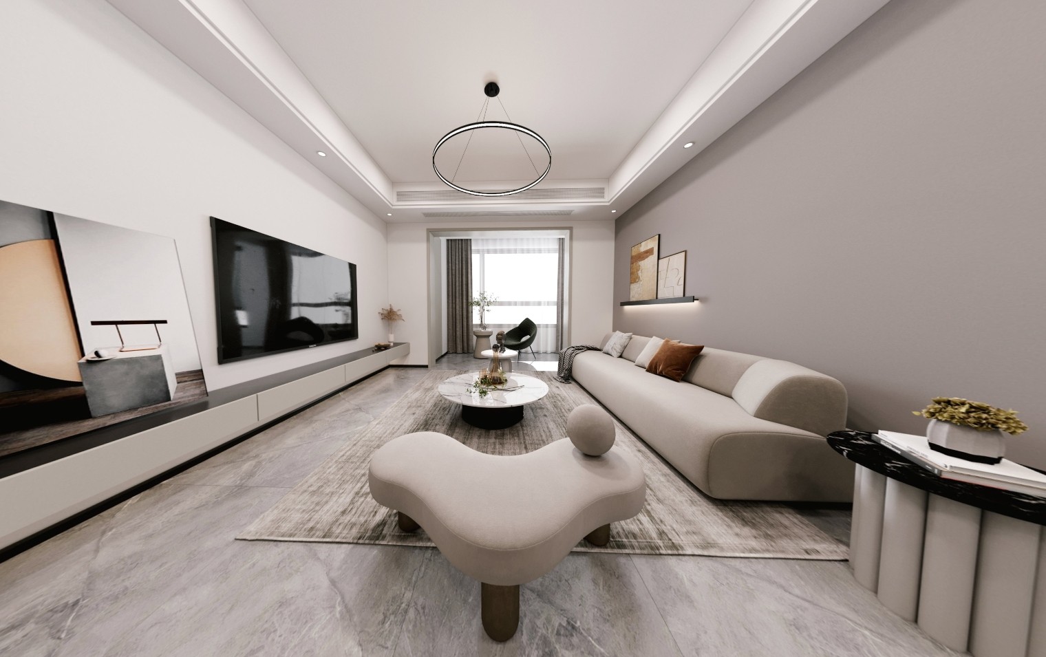 整体色调以灰白为主,营造出简洁明亮的氛围。大面积的落地窗保证了充足的采光,电视墙与沙发背景墙设计简约大方,搭配造型独特的吊灯和舒适的沙发,地面铺设大理石纹理地砖,提升空间质感,尽显时尚与舒适