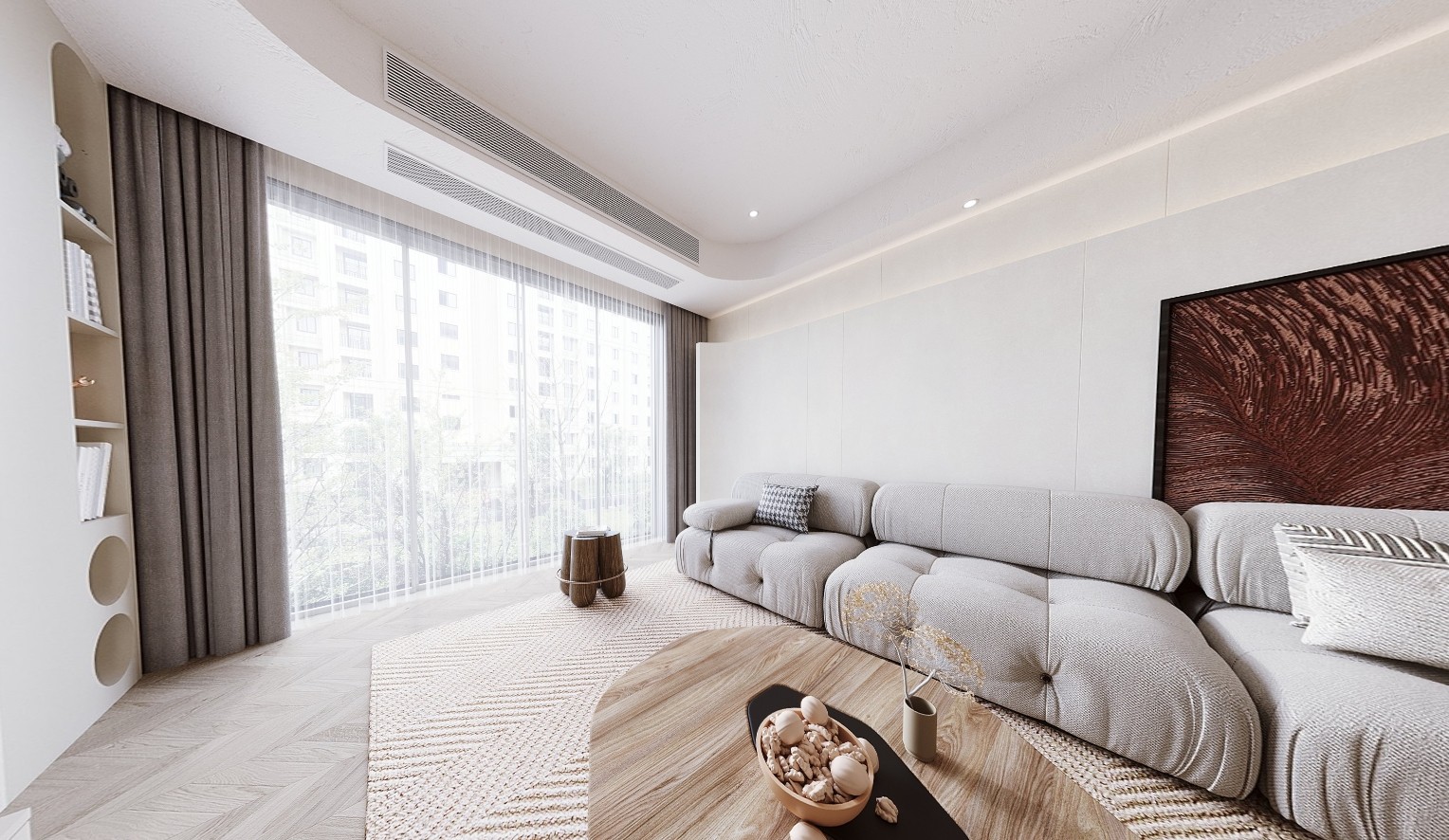 色调柔和,米白色墙面搭配浅木色地板,营造温馨氛围。大尺寸灰色沙发舒适且具现代感,搭配木质茶几增添自然气息。落地窗引入充足光线,使空间通透敞亮。侧边弧形书架设计独特,兼具实用性与美观性,整体布局合理,尽显舒适与雅致