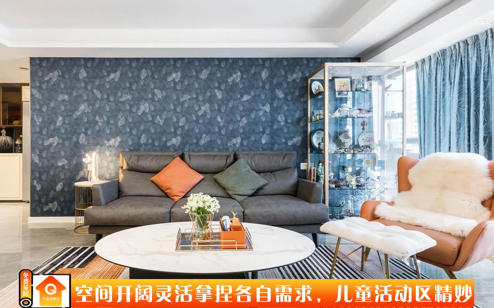 客厅连通阳台做一体化设计,空间显得完整开阔。灰色地砖耐脏好打理,通铺更大气。精致摆件通过玻璃柜展示,清晰明了,并且能遮挡阳光,不直射沙发。