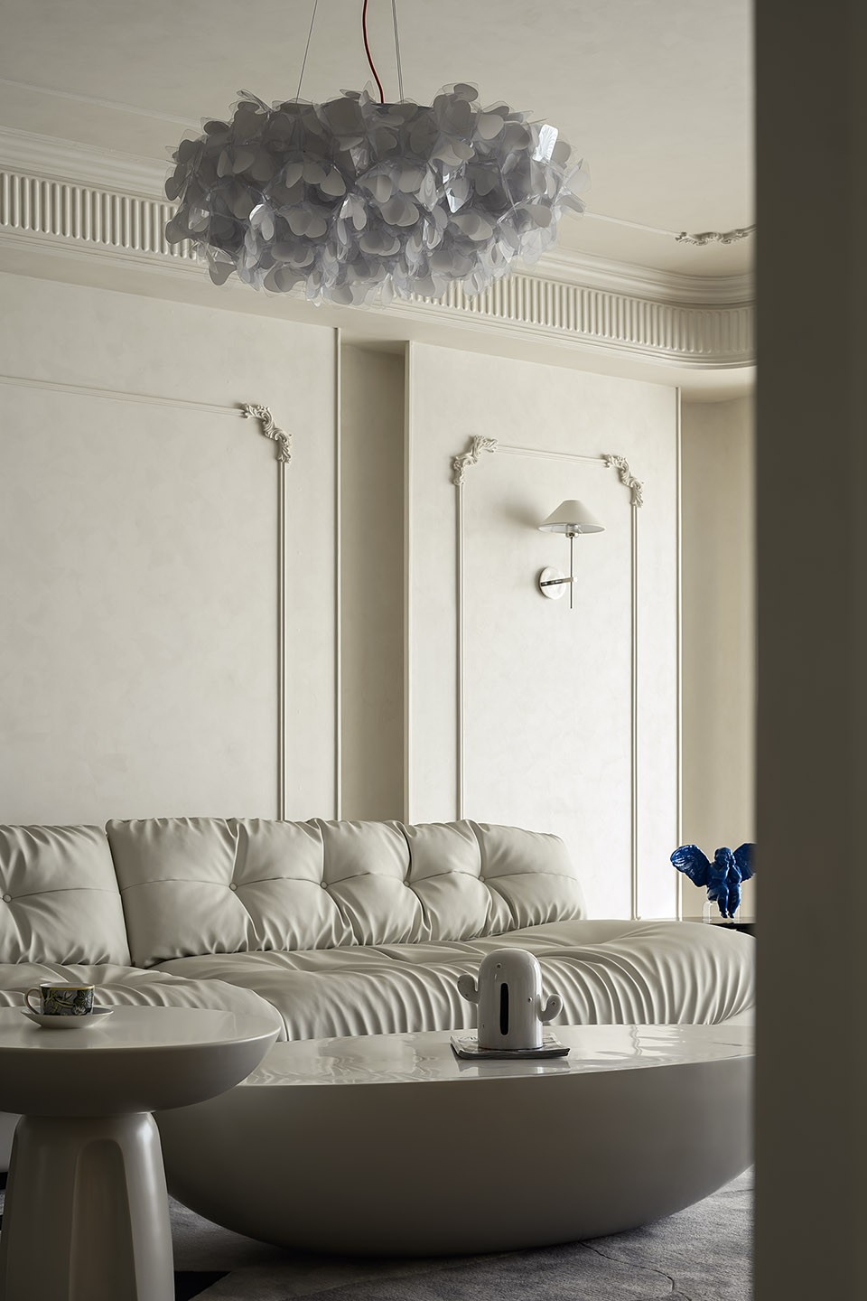 壁炉采用切割洞石包裹搭配仿真火焰设计,不仅在夜晚营造出温馨的光影效果,还为空间注入了一种法式优雅。沙发背后的凸起分隔设计巧妙地丰富了空间层次感,而两侧隐藏灯光的加入进一步强化了客厅的进深与氛围。吊顶选用云朵状吊灯,自然地将视线向下引导,柔化了客厅与玄关之间的视觉对比,使整个空间在视觉上显得协调而不失丰富感。