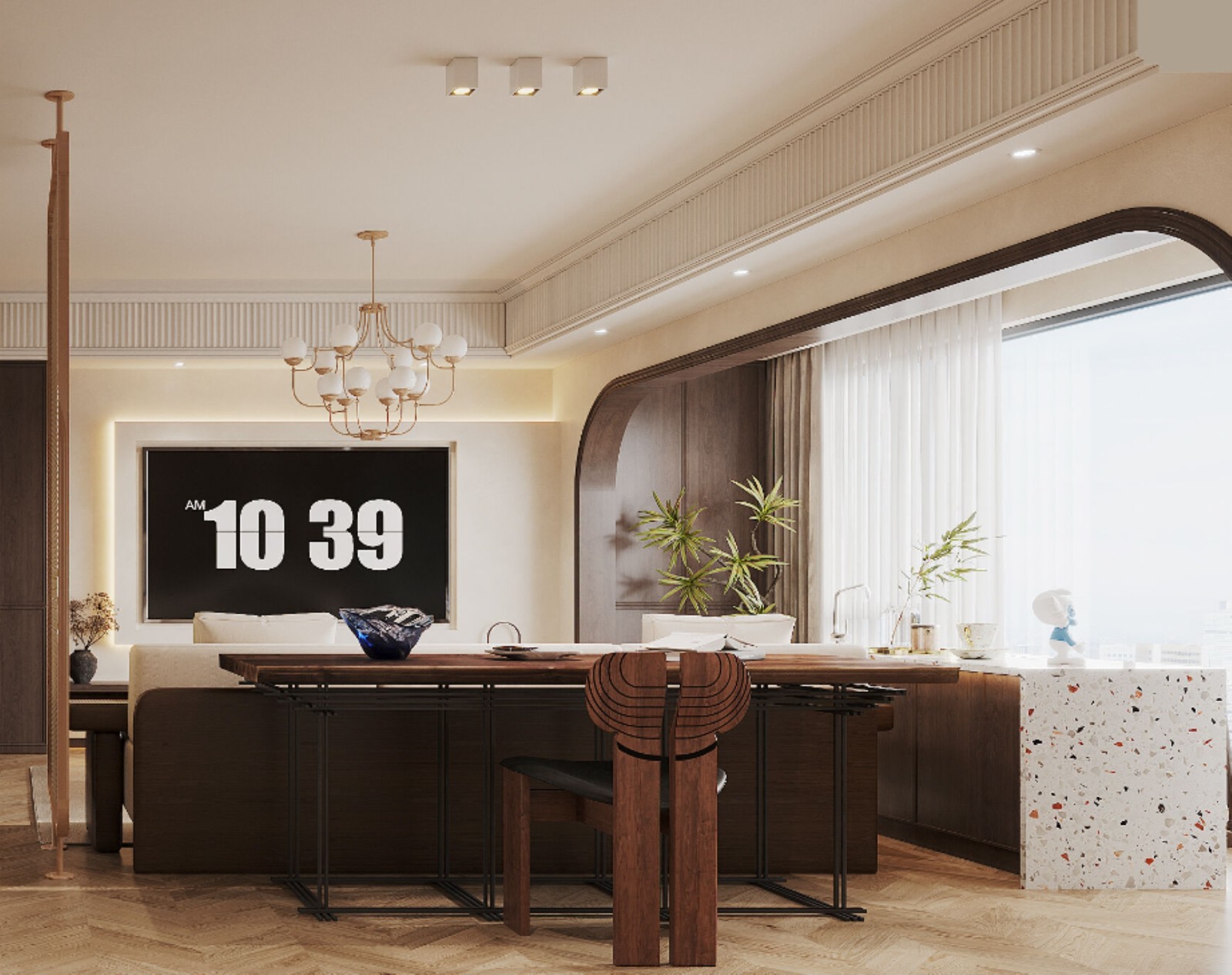开放式餐厨区域,以深棕橱柜搭配米色墙面,沉稳大气。中岛台结合大理石台面,实用且美观,可作备餐与轻食区 。黑色玻璃拱形门,划分空间又保证通透。上方个性吊灯与筒灯组合,提供充足照明。木质鱼骨拼地板,增添温暖质感,整体营造出时尚且具格调的烹饪就餐空间