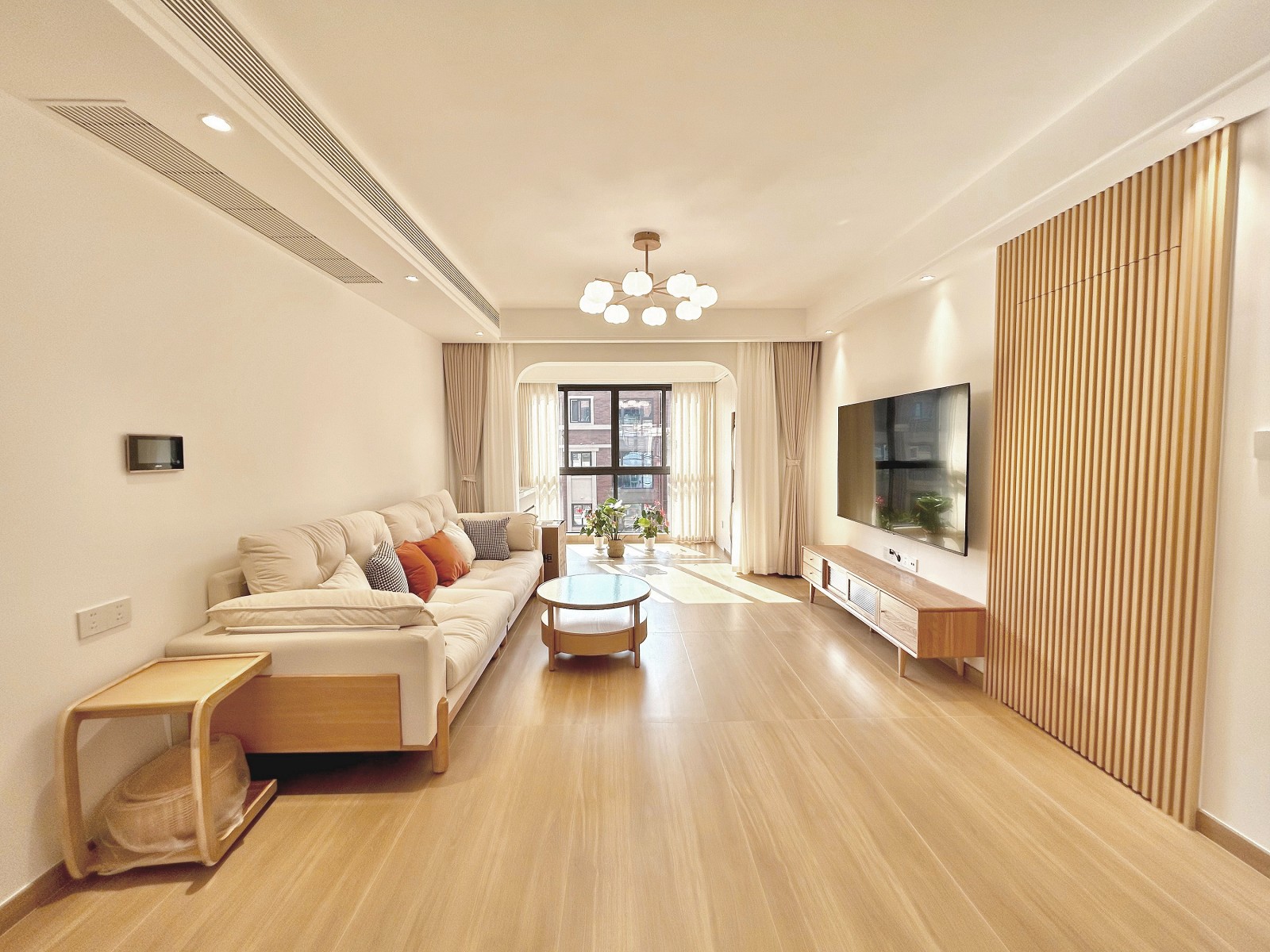 整个客厅空间以浅色调为主,选择原木色地板,使得空间显得更加明亮和宽敞。