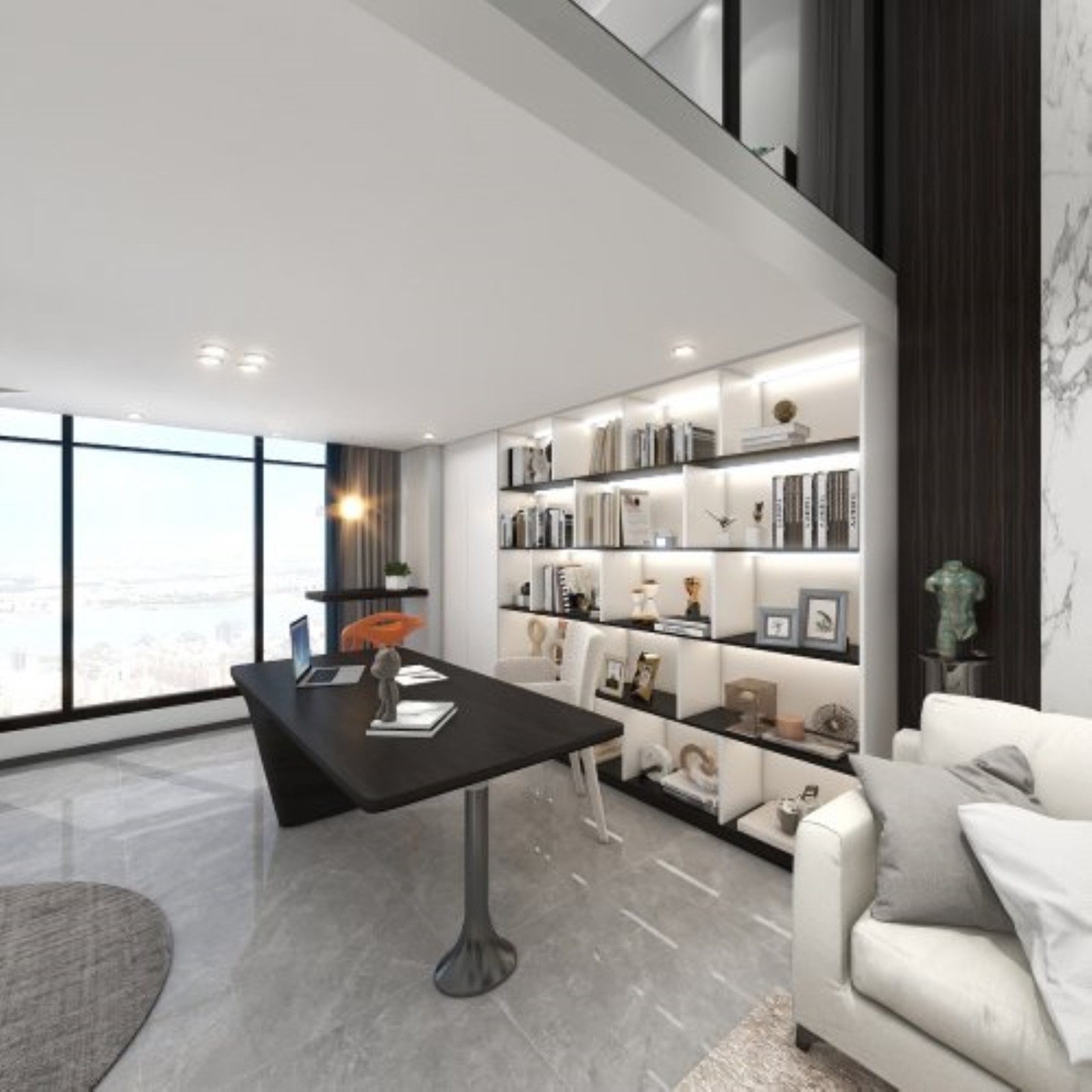 卧室设计舒适,部分拥有***城市景观,提升居住体验。餐厅紧邻楼梯,布置简洁。卫生间与厨房以灰色系为主,实用且具现代感。办公区宽敞明亮,大书架丰富收纳与展示功能。整体布局合理,空间利用高效,尽显简约时尚格调