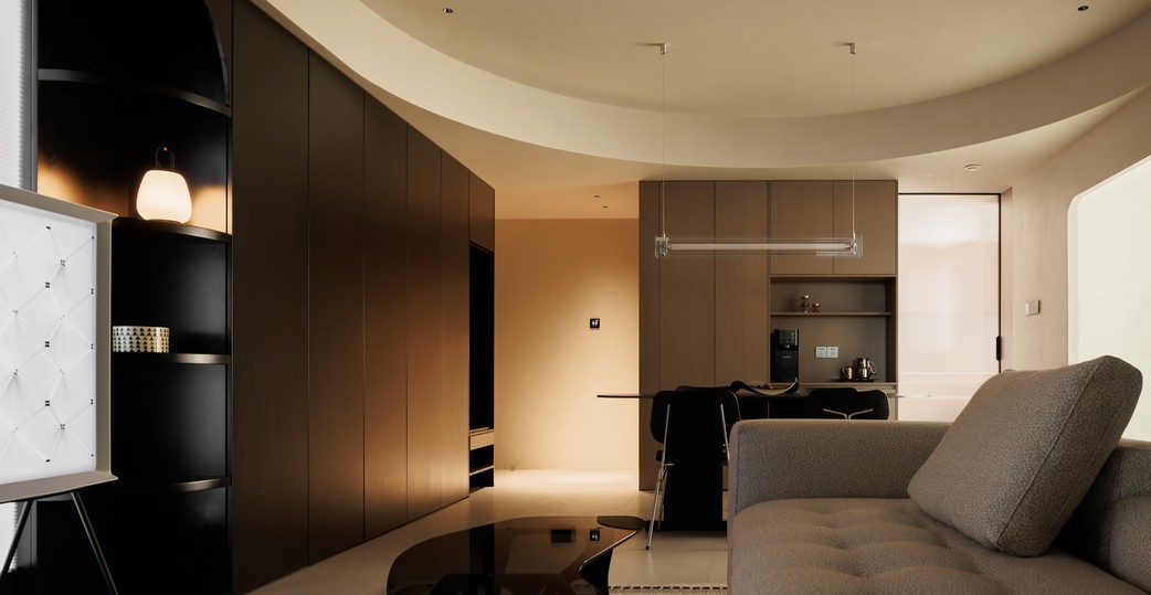 餐边柜上方有一道大横梁,弧线造型的吊顶,很好的解决了层高过渡,客厅一整面的黑色柜体,立稳根基。