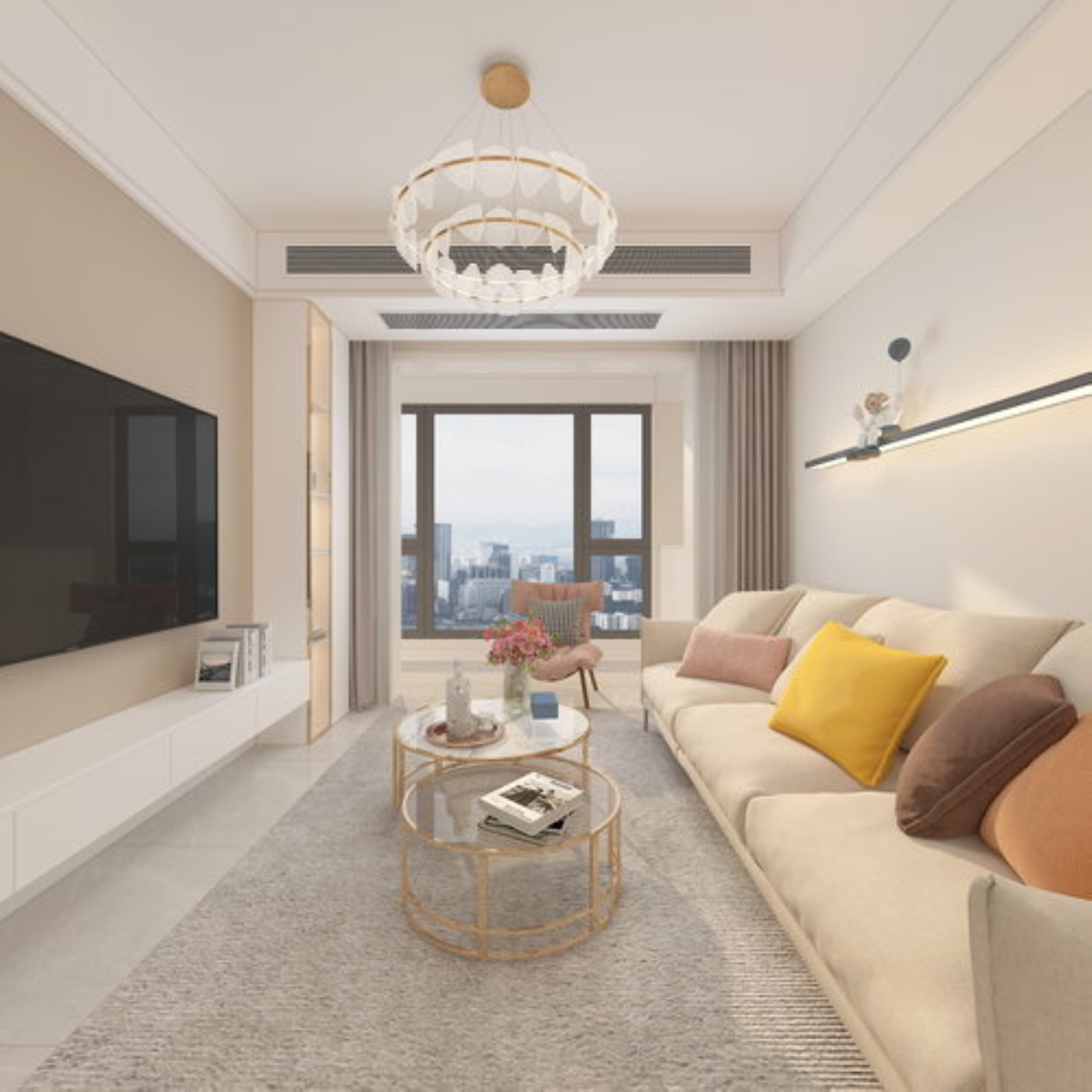 以米、白为主色调,搭配浅咖窗帘,营造柔和氛围。亮色抱枕为空间添活力。大型吊灯提升格调,无主灯设计增加层次感。整墙电视柜实用大气,落地窗外城市景观开阔。整体布局合理,既满足日常休闲,又彰显时尚品味