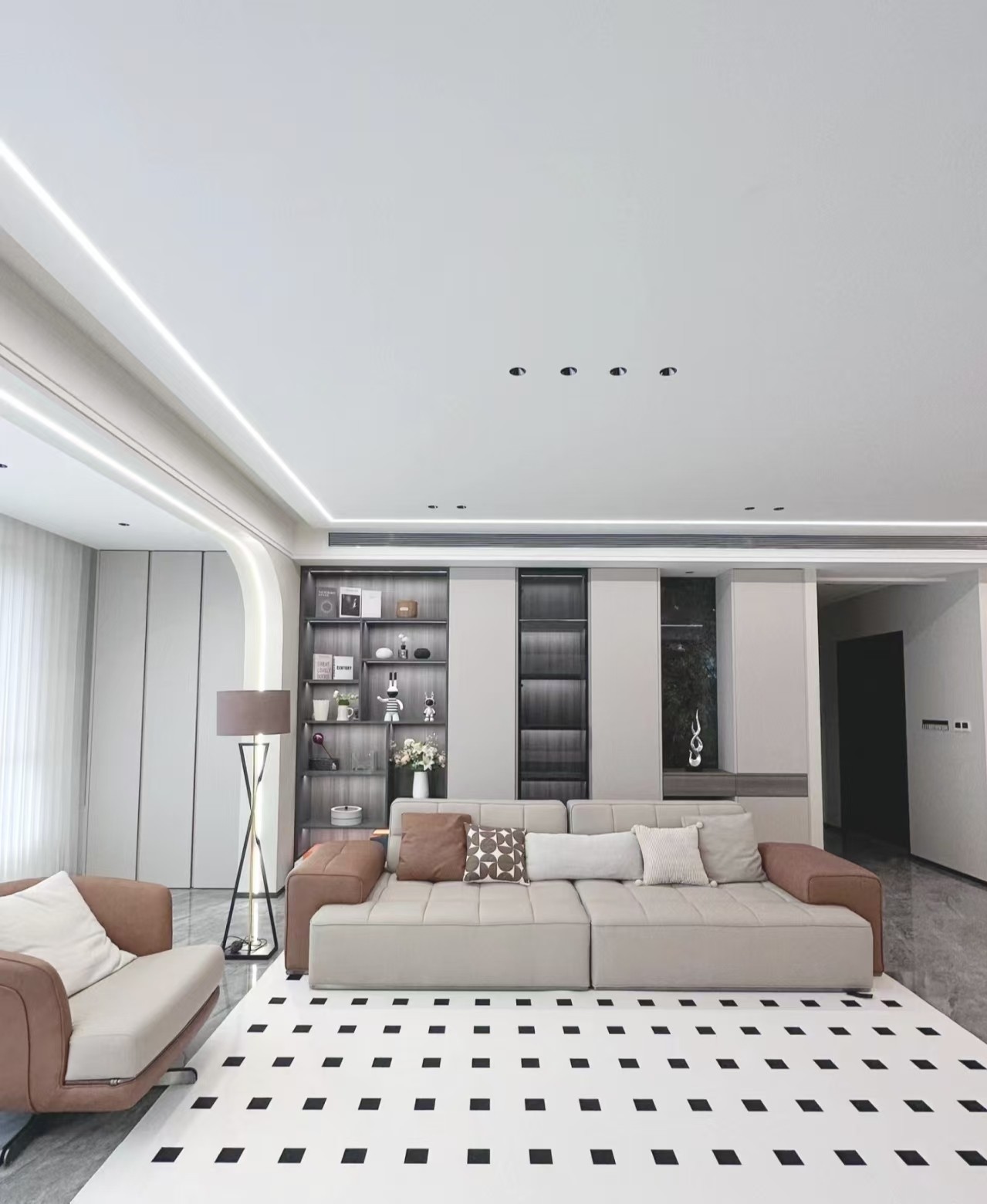 客厅没有繁复的隔断,采用开阔的大通铺设计,墙面柔和的米白色。