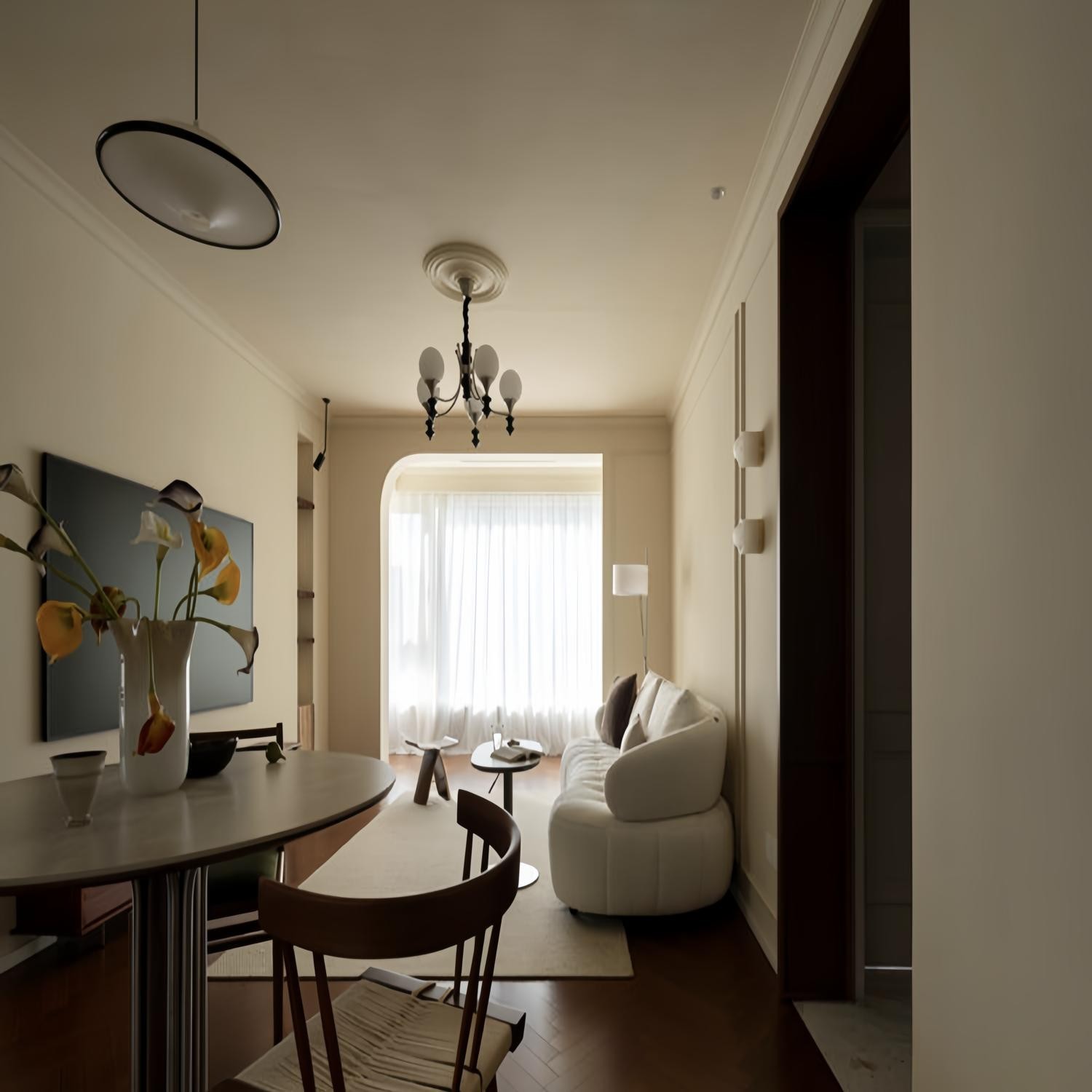 大电视、大沙发对于家庭休闲是必不可少的,这是一个设计挑战。因为方正的格局、家具的尺寸可能会破坏空间的美感。为了解决这个问题,设计整合了厨卫门洞,统一了空间。