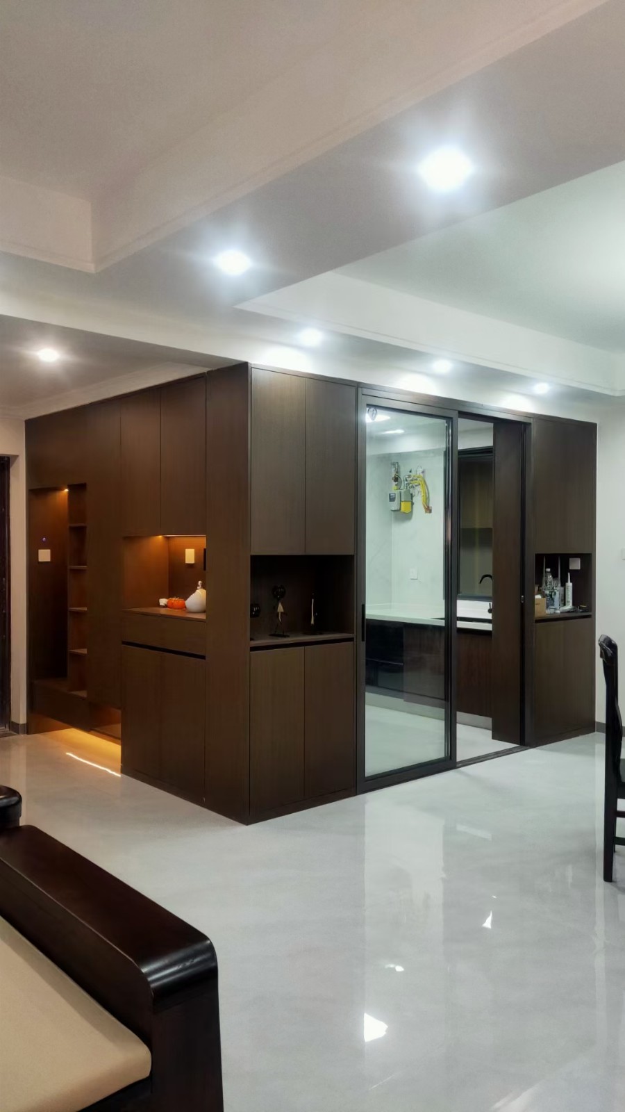 鞋柜连接酒柜增加储物空间,加大餐厅空间,放得下大圆桌