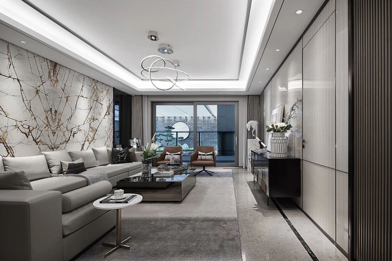 这是一个四房两厅两卫的户型 设计师对空间进行重组 ,使空间达到合理利用,整体空间以现代暖灰雅致为基调 配以灰色木饰面 暖灰系墙纸,为空间营造一种神秘的氛围