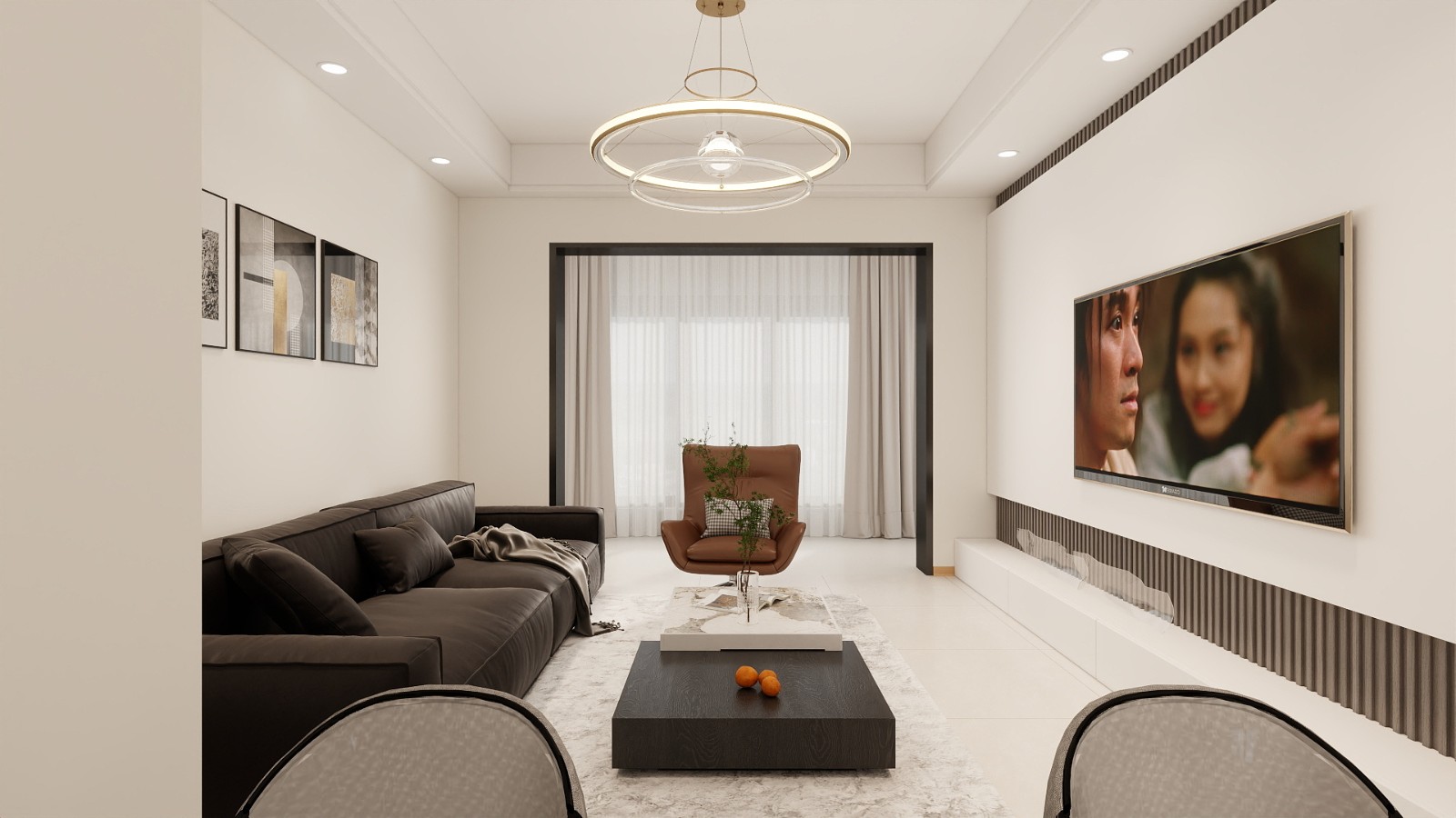 开阔通透,强调社交与休闲功能。 墙面与地面:白色乳胶漆墙面搭配浅色木格栅板电视背景墙,浅橡浅色哑光转延伸视觉连贯性。 家具布局:直线条布艺沙发搭配几何切面茶几, 功能延伸:与生活阳台打通,采用阳台增设线性绿植墙与折叠晾衣架,兼顾采光与实用性。