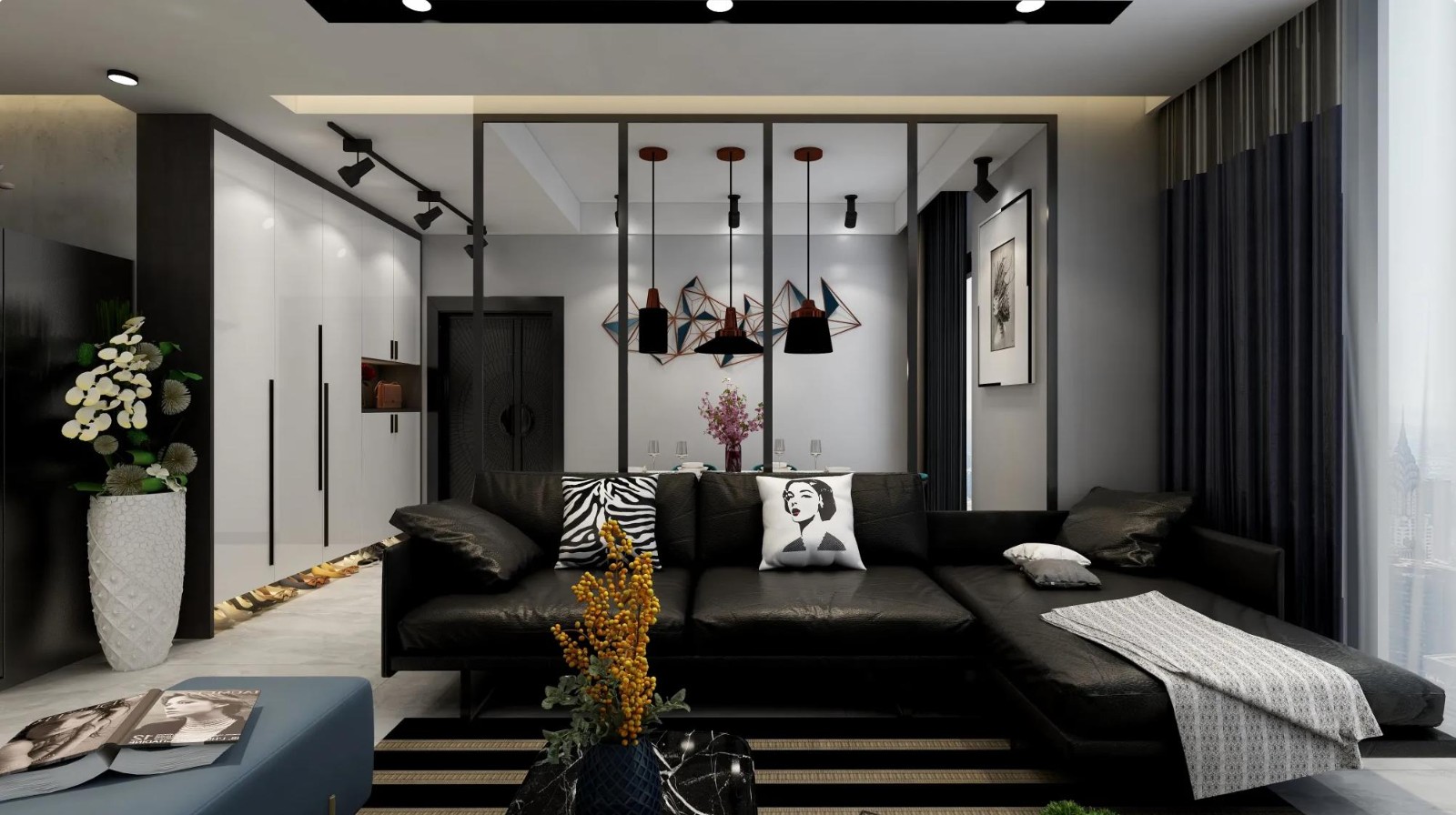 客厅采用现代风格设计,以黑、白、灰为主色调,搭配金属元素,营造出时尚且富有质感的氛围。黑色皮质沙发搭配个性抱枕,沉稳大气。金属边框玻璃隔断,划分空间的同时增加通透感。背景墙装饰几何造型灯具与艺术挂件,搭配轨道灯,强化空间立体感与设计感。地面黑白条纹地毯与整体风格呼应,提升格调。
