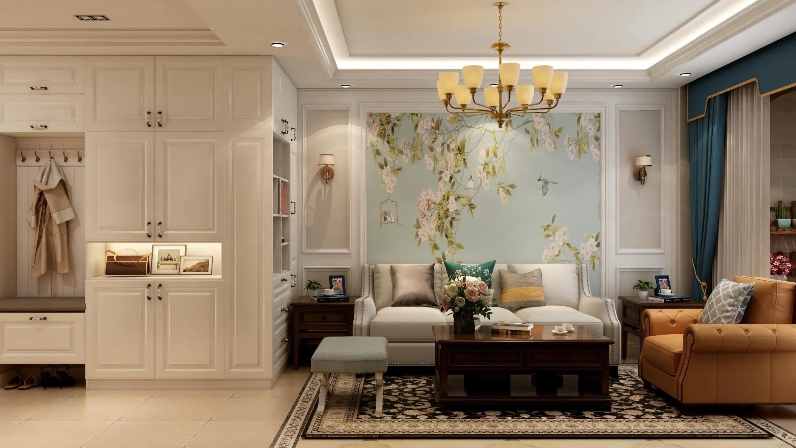 装饰精致,白色柜体搭配金色吊灯,尽显优雅。沙发背景墙绘有花鸟图案,搭配色彩丰富的抱枕,营造出温馨浪漫的氛围 。