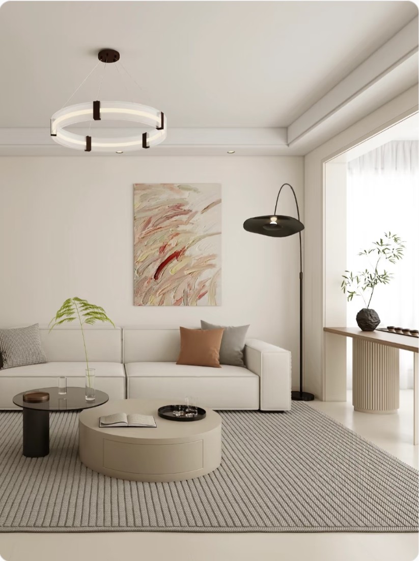 本案原始户型通透,无需较大改动。只选取温柔的奶油色作为背景,用线条简洁的石膏板背景墙、质感***的岩板茶几等家具来装点