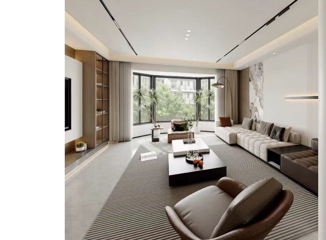 模块化沙发搭配圆形岩板茶几,线性吊灯与方形地毯形成点线面互动,空间宛如立体构成教案。