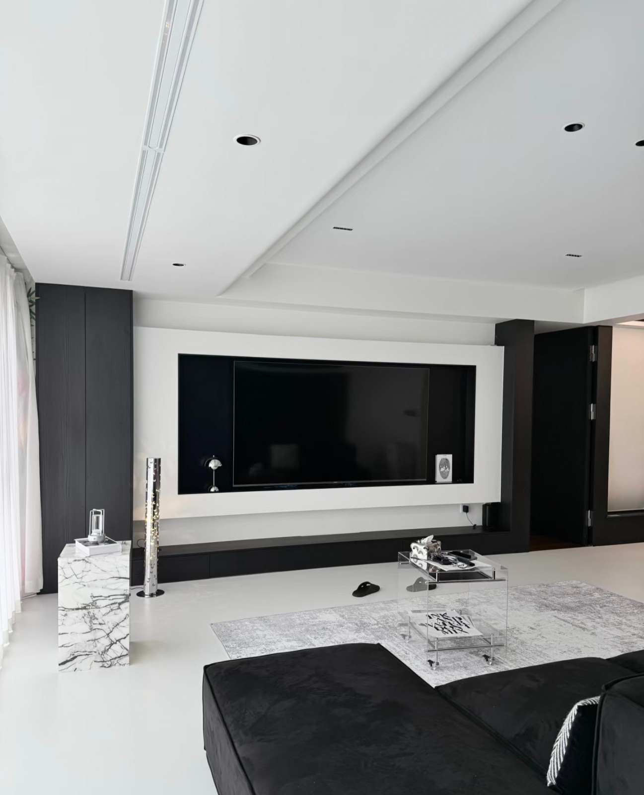 四叶草户型,四室改三室 敲掉了一个房间,打通了阳台,拥有了6.9米大横厅 1.客餐厅一体化的设计 2.吊顶主要是悬浮和回型顶,无主灯真的比不做无主灯***很多 3.瓷砖900x1800,用大砖就不要选小 4.无主灯配柔光砖,特别出效果还不反光,调色的聚脲美缝让整体达到微水泥的效果 5.一个空间不要超过3种颜色 如果选择了这种黑白的极简,就不要选择太多高饱和色系。特别是软装很容易就变风格了!