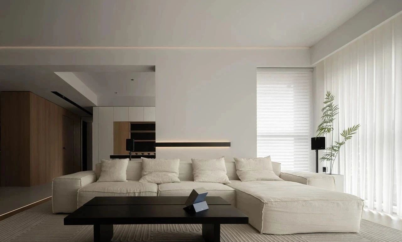 选择亚麻布艺沙发,搭配复古黑色木质茶几,散发出宁静自然之美
