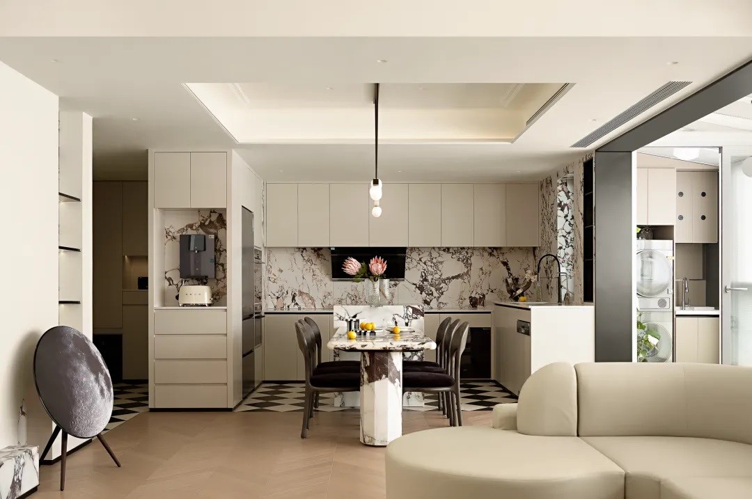 餐厨与客厅以开放式设计打破界限,形成互动共享的洄游动线。
