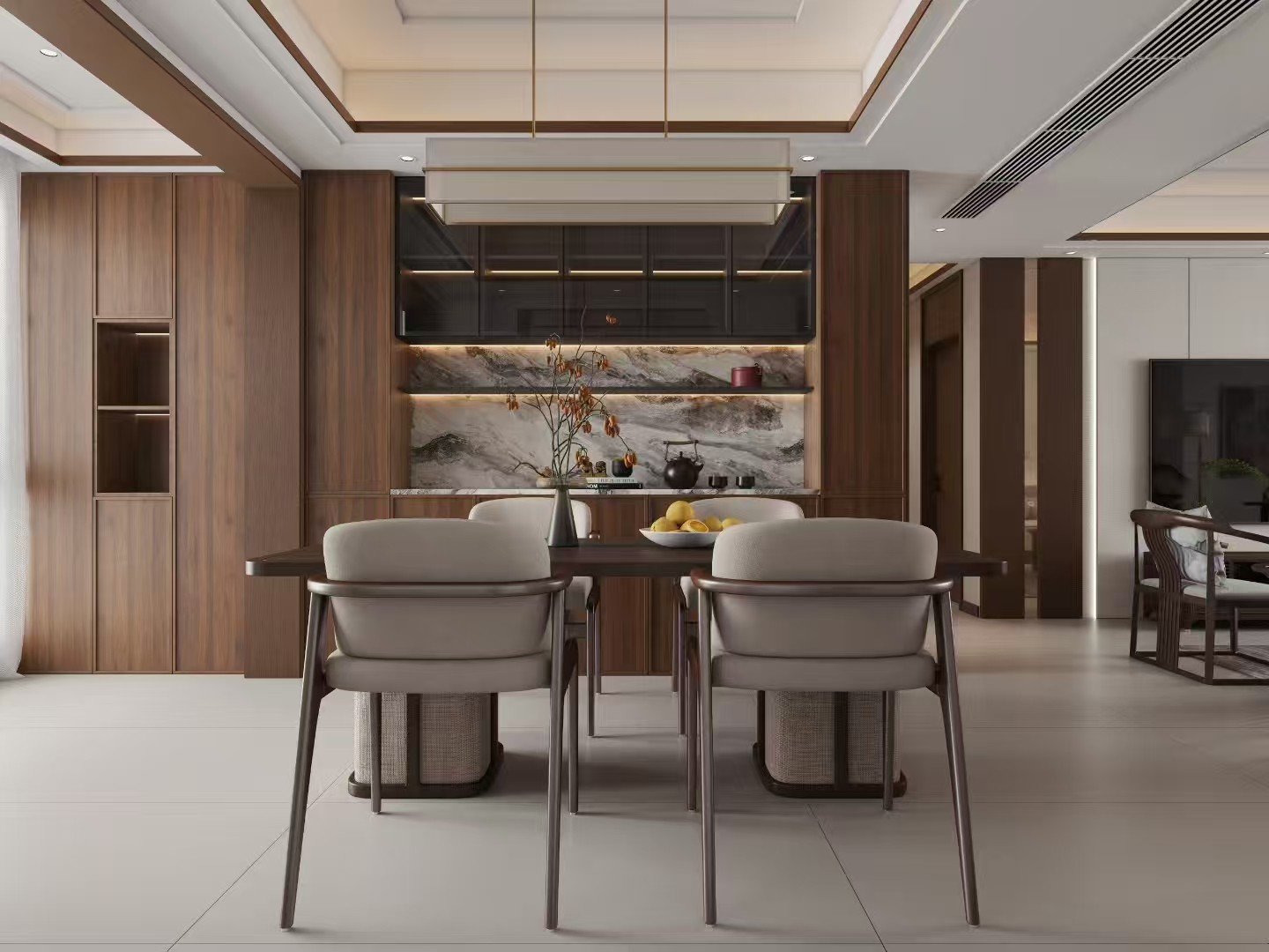 作为家的过渡与交流空间,新中式风格在此体现为木质餐边柜的收纳与展示功能结合,大理石山水纹背景呼应中式意境,简约吊灯、现代感座椅,让用餐场景既有传统韵味底蕴,又符合当代便捷、美观的使用需求,成为连接内外、融合风格的过渡区域 。