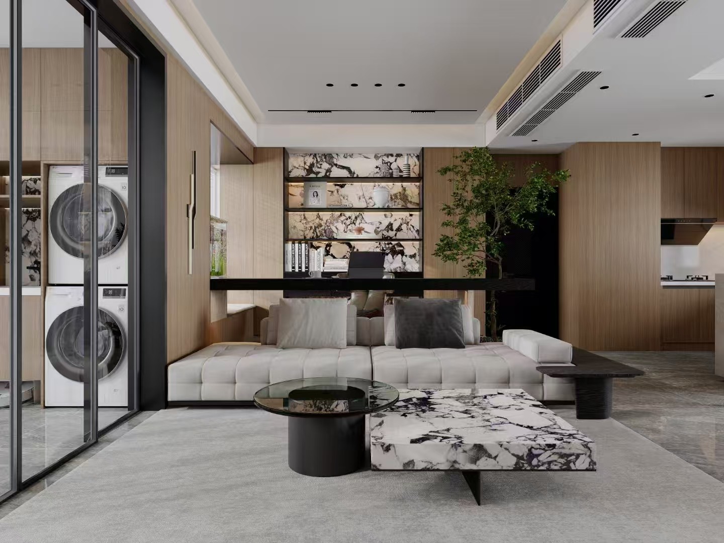 现代简约融合轻奢感,黑白灰基础色调,简洁造型家具,隐藏式收纳与线性灯光,打造静谧、整洁休憩空间。