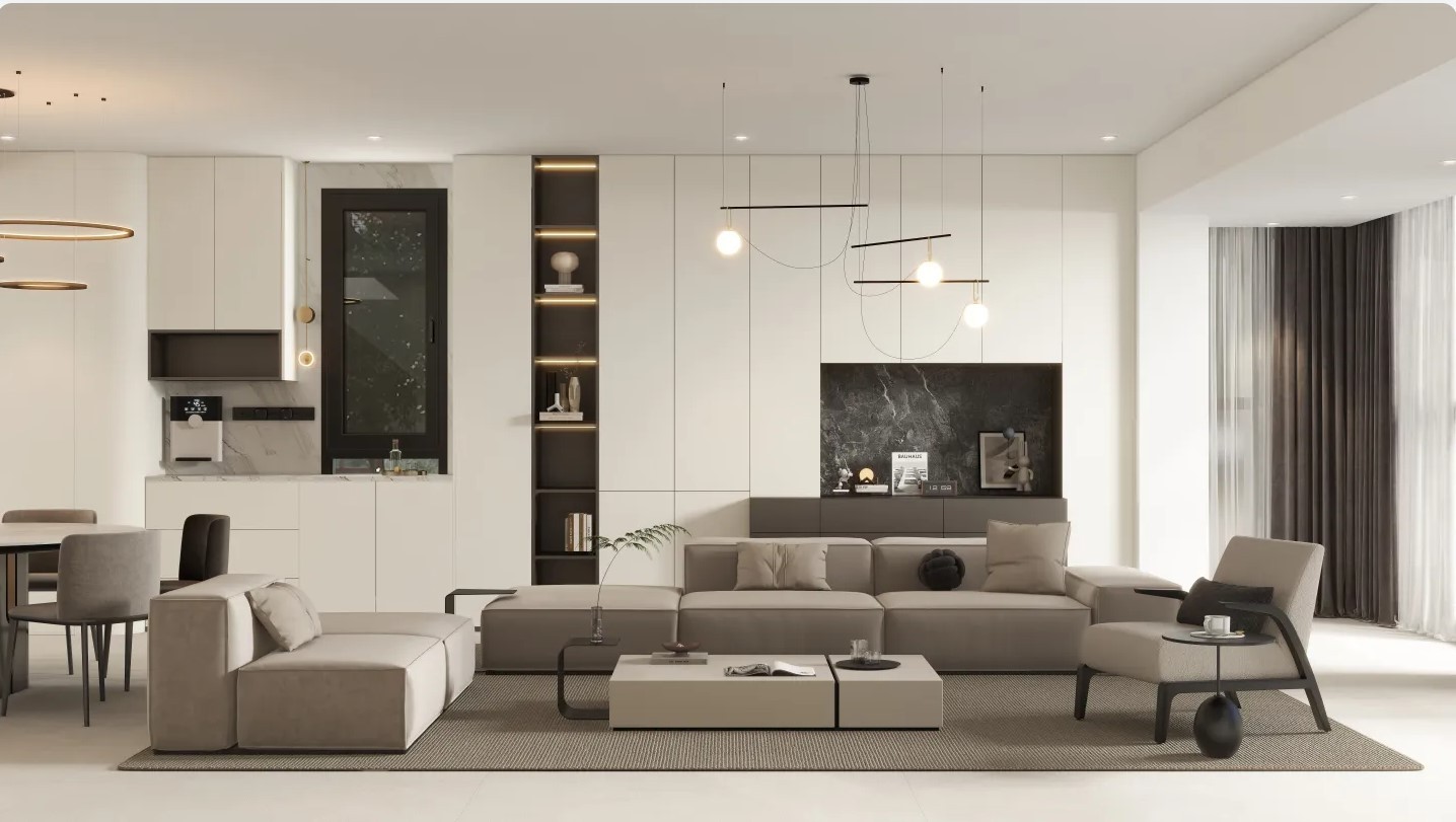电视墙与餐边柜一体化设计,利用垂直空间打造满墙柜体,实现收纳与展示功能平衡。木色开放格、灯带划分区域,让客厅与餐厅自然衔接,小户型也能整洁有序。