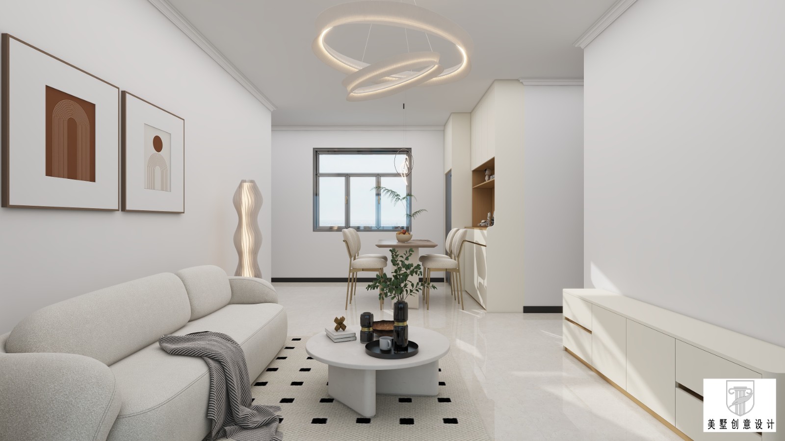 这是现代简约风客餐厅,以白色为主调,搭配浅灰地毯、圆形茶几,简洁大方。环形吊灯造型别致,沙发上搭灰色毯增添温馨,连通餐厅区域,摆放圆形餐桌与餐椅,空间开阔通透,营造出舒适、时尚的居住氛围 。