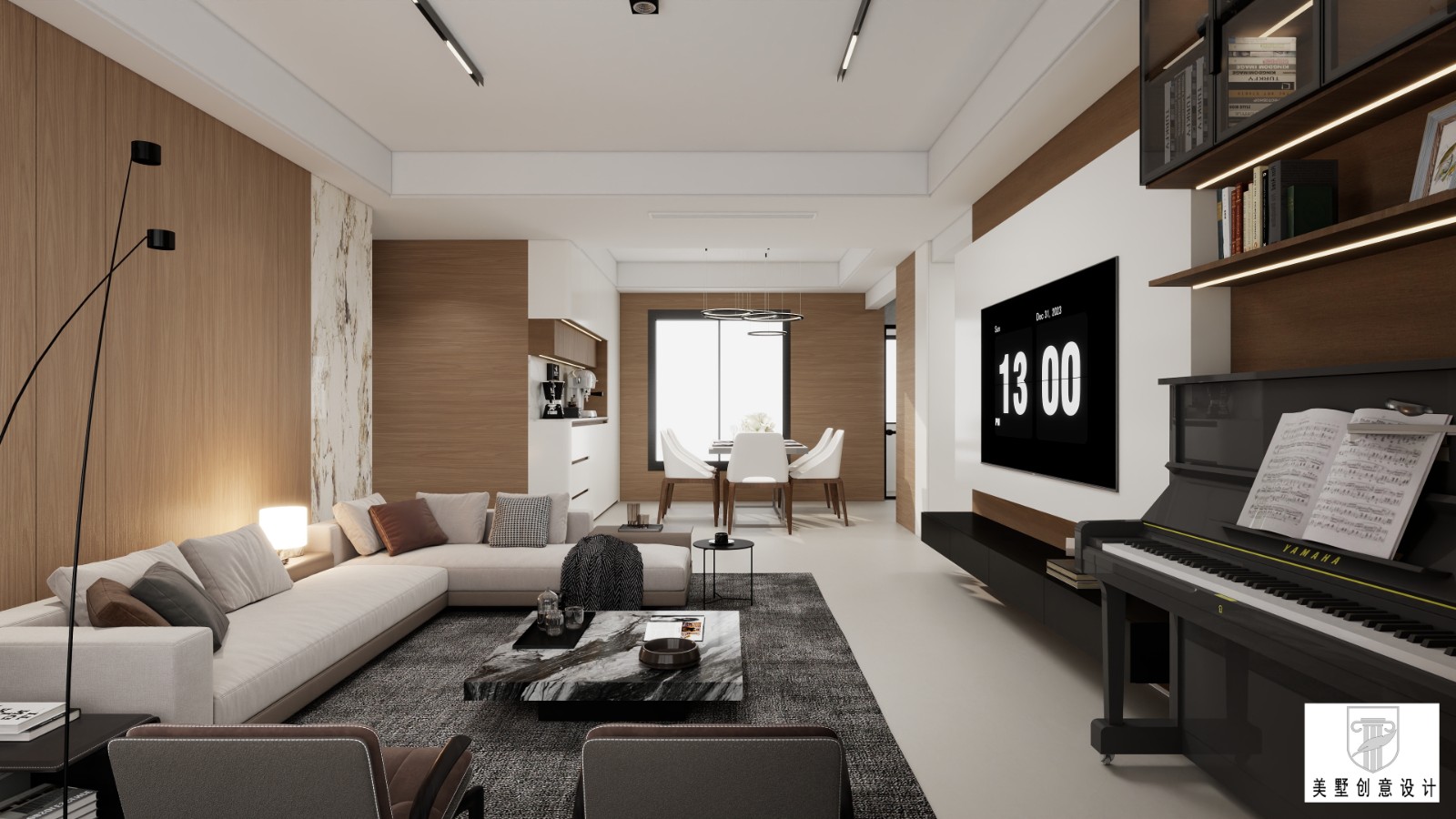 这是现代简约风格的客餐厅空间。整体以浅色调为主,搭配木饰面营造温馨感。客厅有L型沙发、茶几,电视墙简洁,嵌入大屏显示时间;餐厅在远端,靠窗设餐桌椅,空间开阔通透,还融入钢琴元素增添艺术氛围,灯光设计合理,营造出舒适且有格调的居住环境,应该是基于前面“白云尚城”户型的装修效果呈现 。