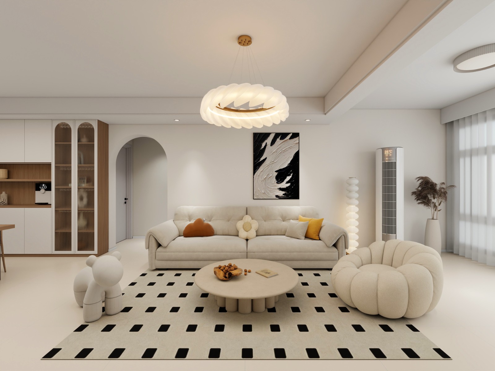 简约干净的硬装和温柔细腻的软装搭配,整体色调统一,造型和材质上凸显出可爱软萌气质