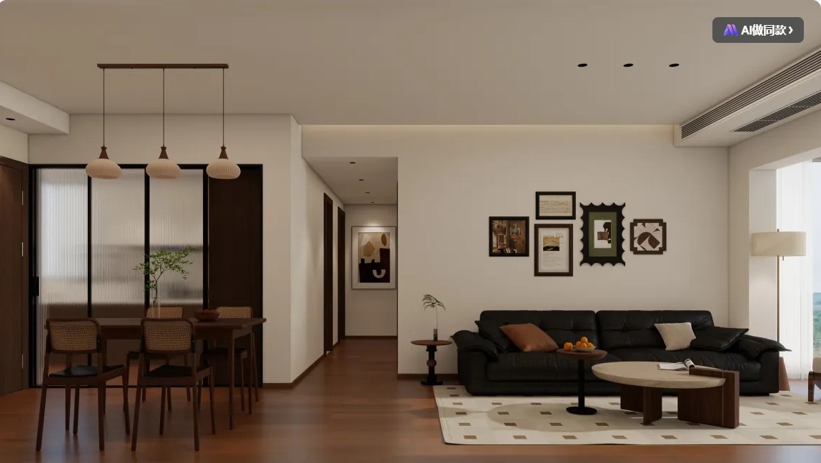 沙发白墙,黑色皮质沙发,复古深色木地板。