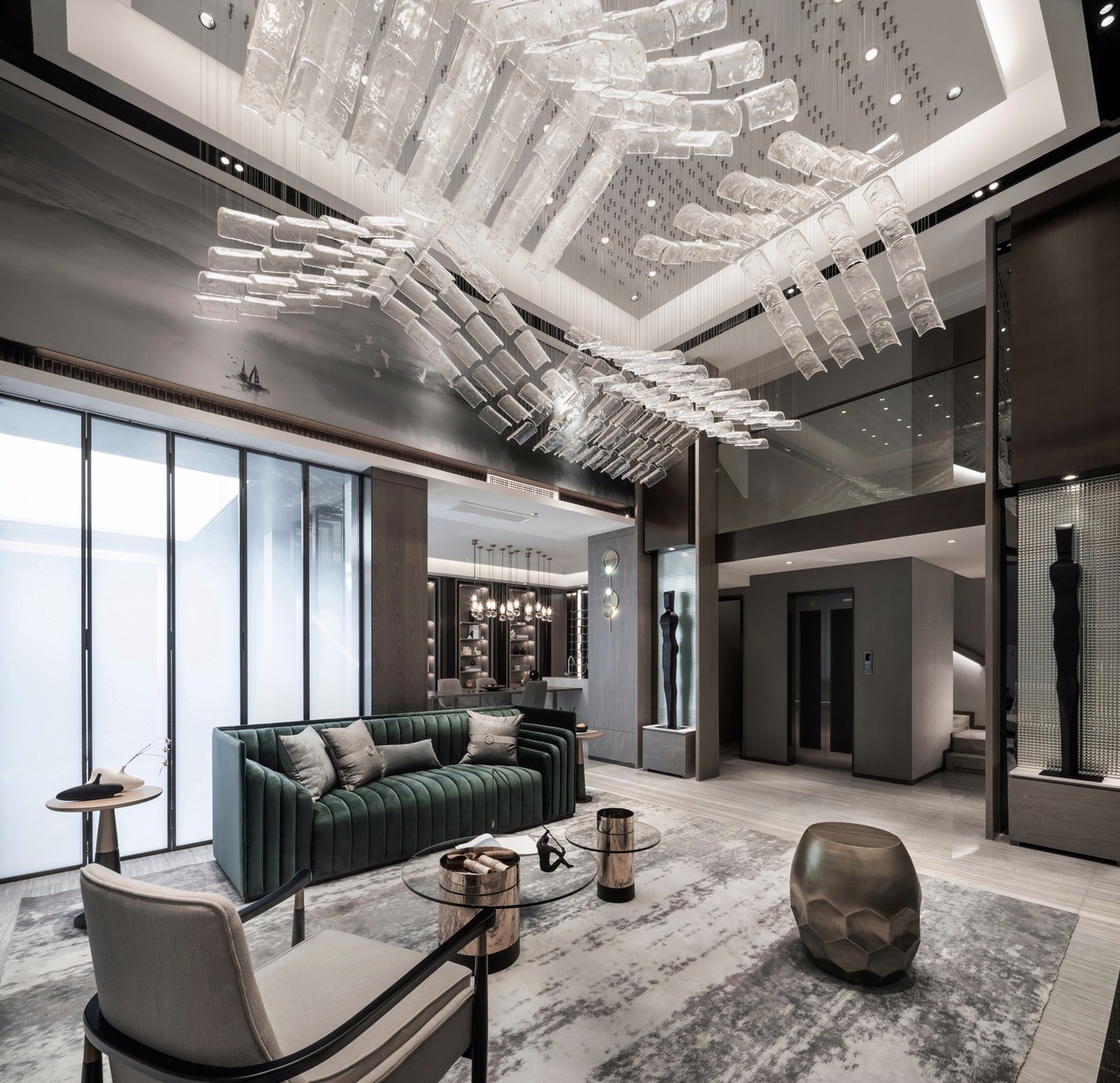 清光从折叠玻璃门中洒然而下,为地下空间投入参差斑驳的阴影,亦带来明丽的光亮,隐隐透着不规则的朦胧感,静影成壁,令人沉醉。