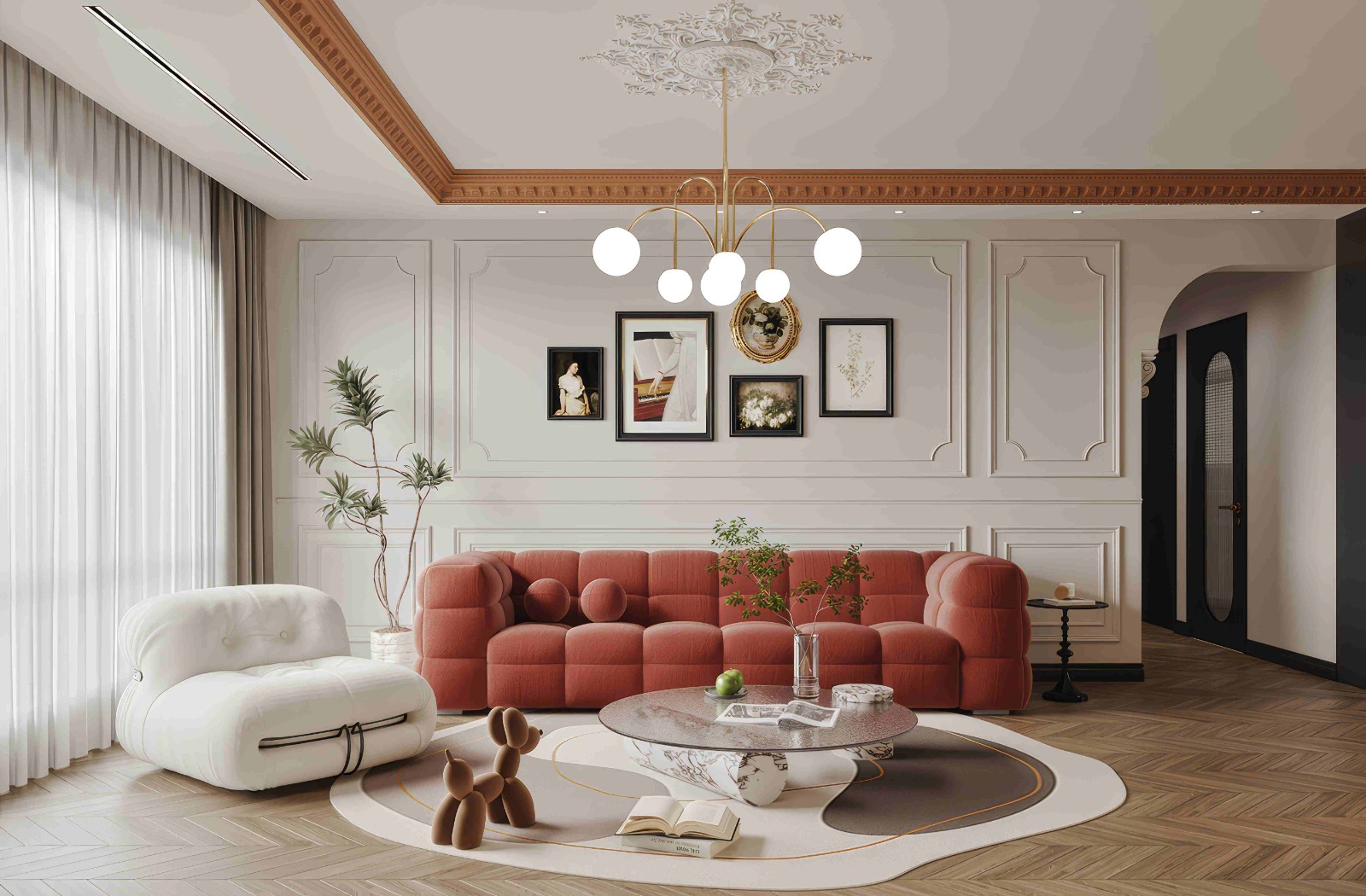 雅致客厅:红绒沙发配圆几,金灯护墙画镜,拱门引光。