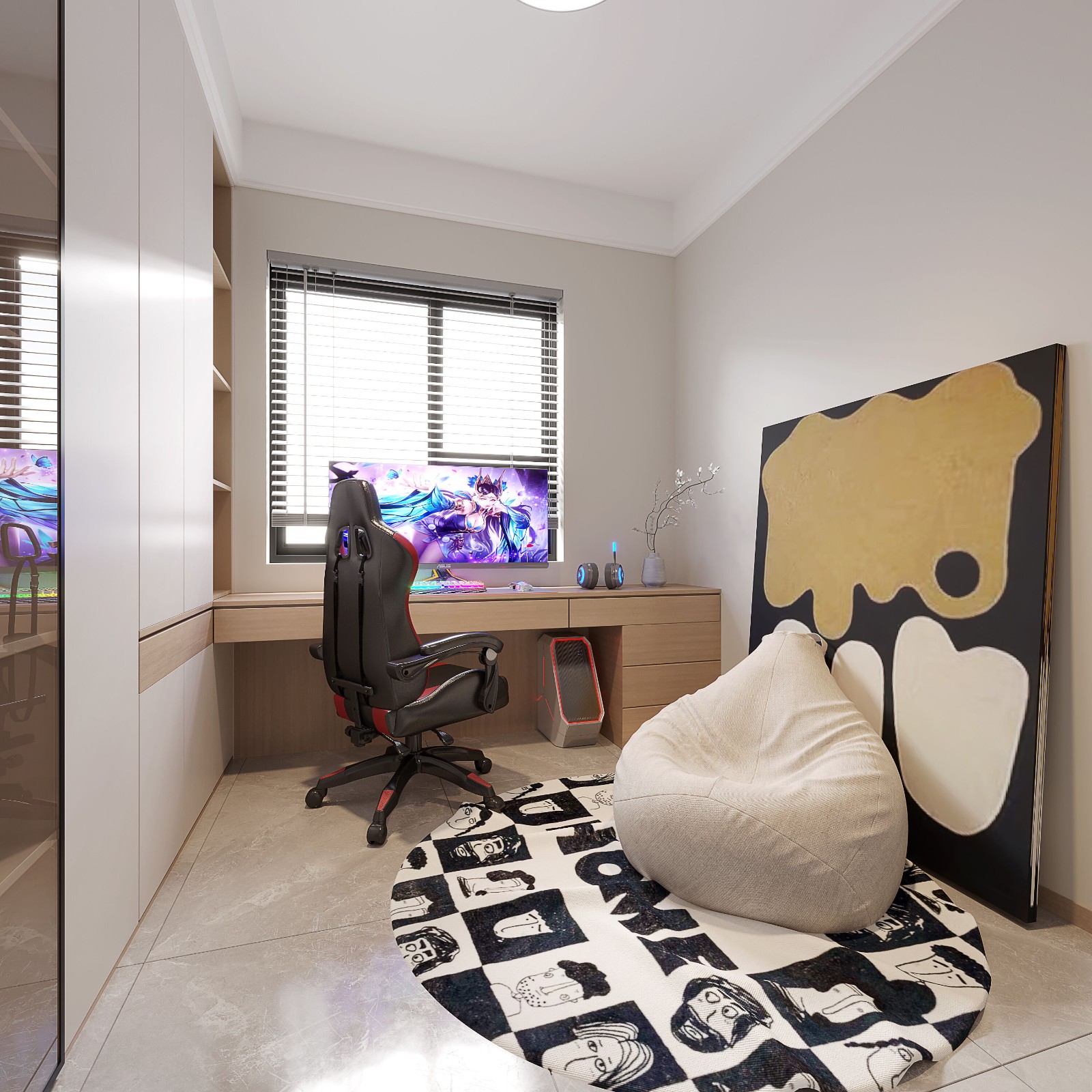 电竞书房:彩屏黑红椅配豆袋,抽象画地毯,百叶窗透光。