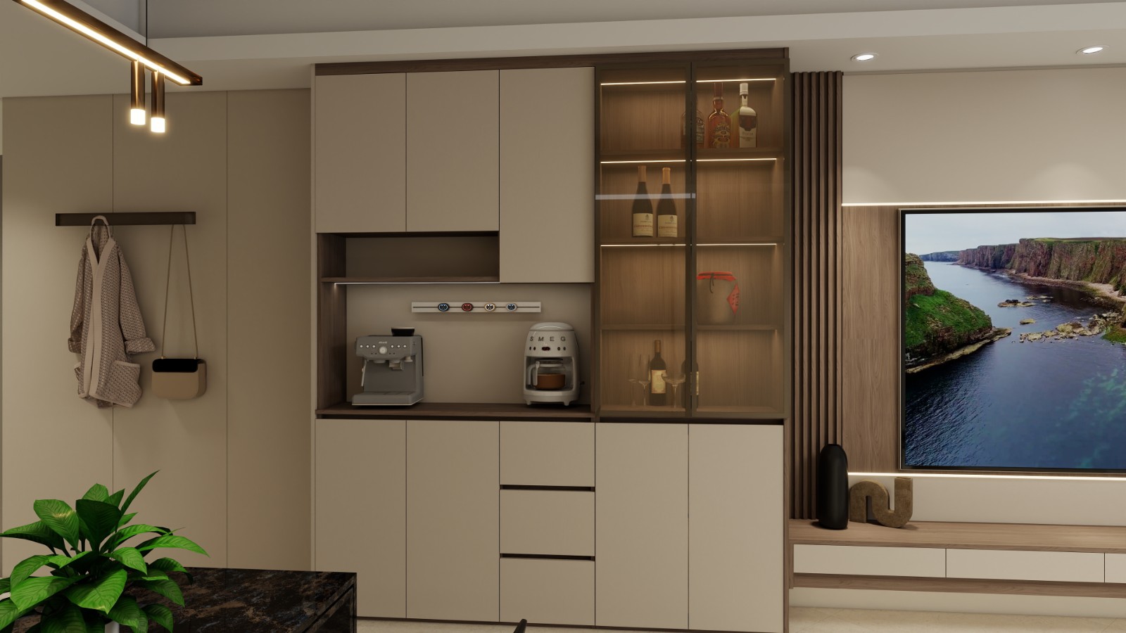 设计思路:将收纳、展示、休闲功能集于一体。设置挂衣区、电器放置区和玻璃酒柜,满足多样需求。 • 客户角度:挂衣区方便挂放外套,电器放置区可放置咖啡机等小家电,酒柜满足客户收纳美酒需求, 功能多样且实用。