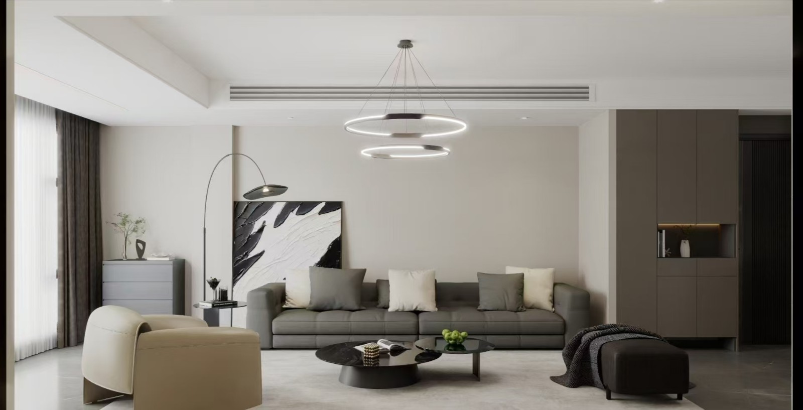 现代侘寂风,低饱和色调搭配自然材质,开放式布局营造松弛互动氛围。