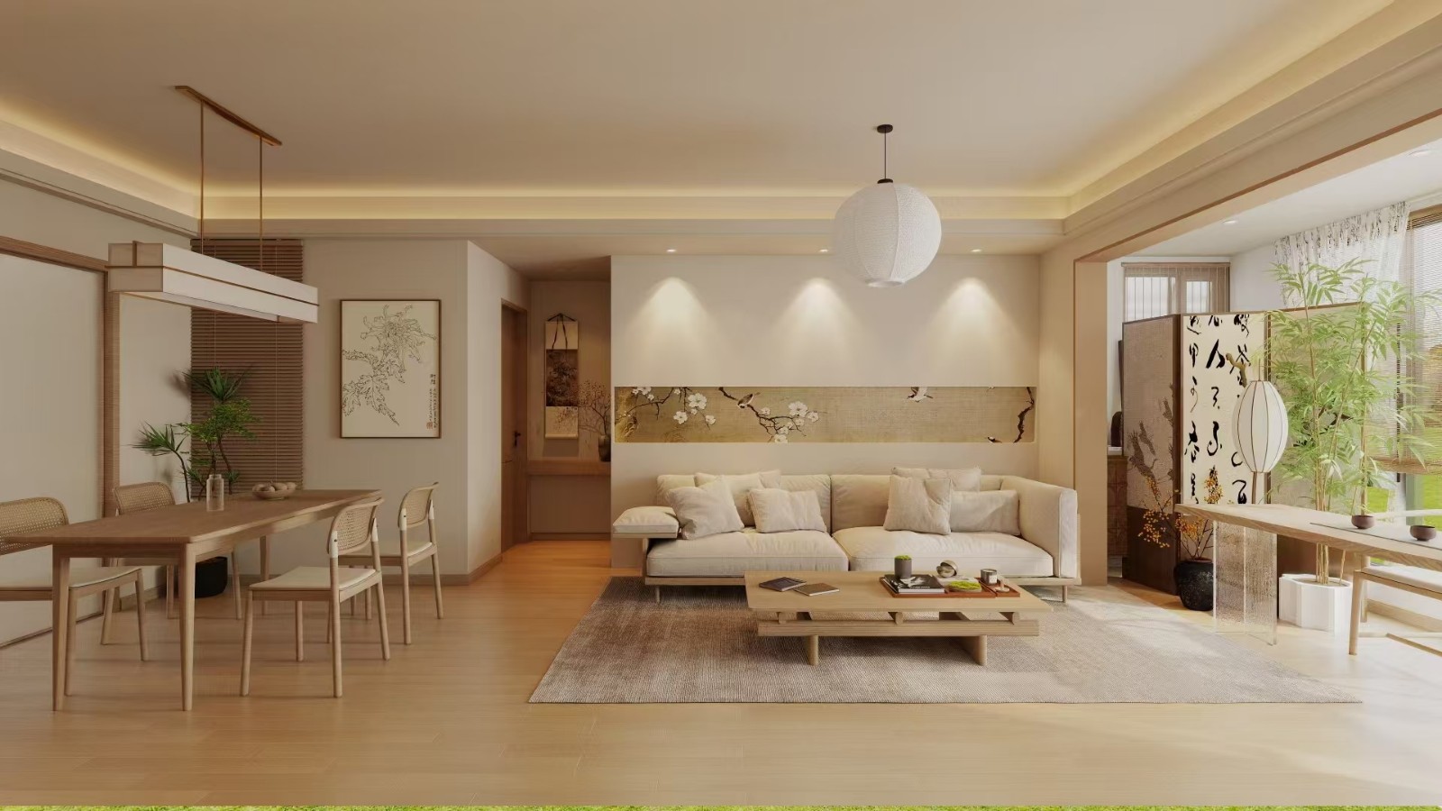 日式原木风为底色,浅米色墙面与温润木地板呼应,大面采光窗引入充足自然。 悬浮吊顶藏线性灯带,搭配球形、长条形特色吊灯,电视墙摒弃繁杂,以简洁柜体、绿植点缀,营造松弛治愈的家庭核心互动区,传递自然本真的生活感。