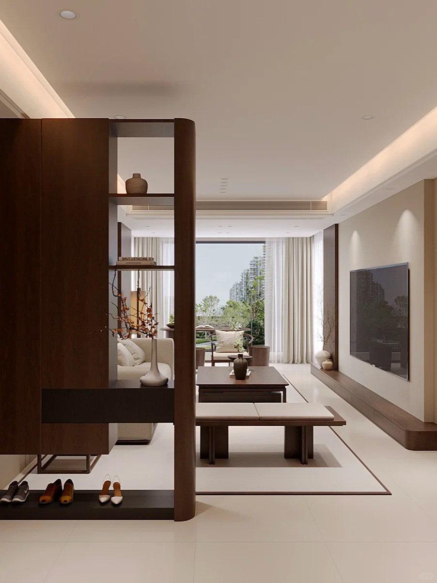 客厅:空间开阔,以浅色调为主,搭配深色木质家具。利用隔断划分区域,既保证通透感又有空间层次。天花板简洁,灯带营造温馨氛围,大窗户引入充足自然光线,窗外景色可借景入室,整体营造出舒适、雅致且开阔的起居环境 ,展现出简约大气又不失温馨的格调。
