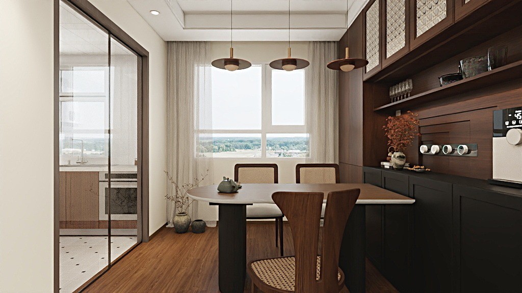 摆放复古与现代结合的餐桌 藤编柜门