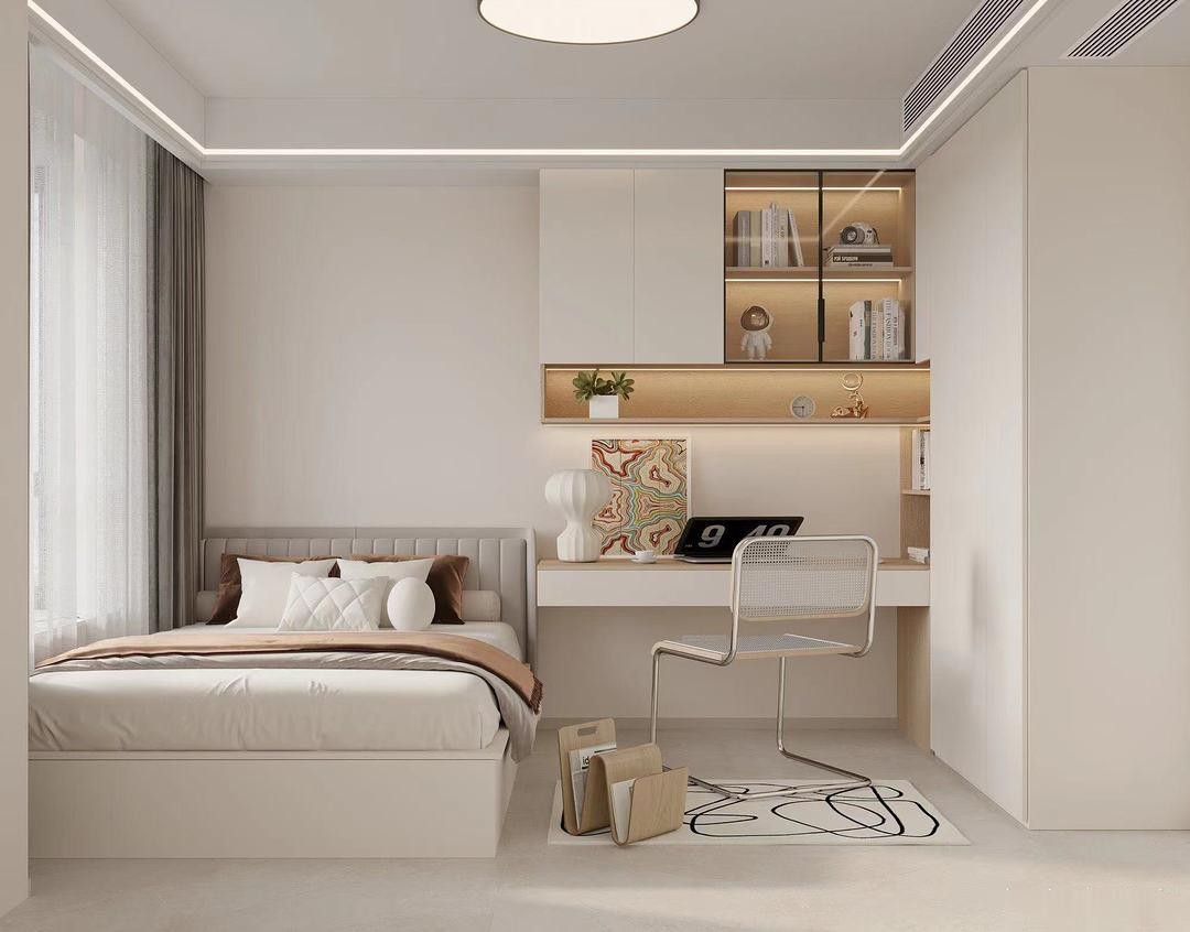 儿童房的设计布局,一张1.5米的床,一排书桌加吊柜满足孩子的学习空间,可以用线性灯做辅助光源,给整体营造一份温馨的氛围。