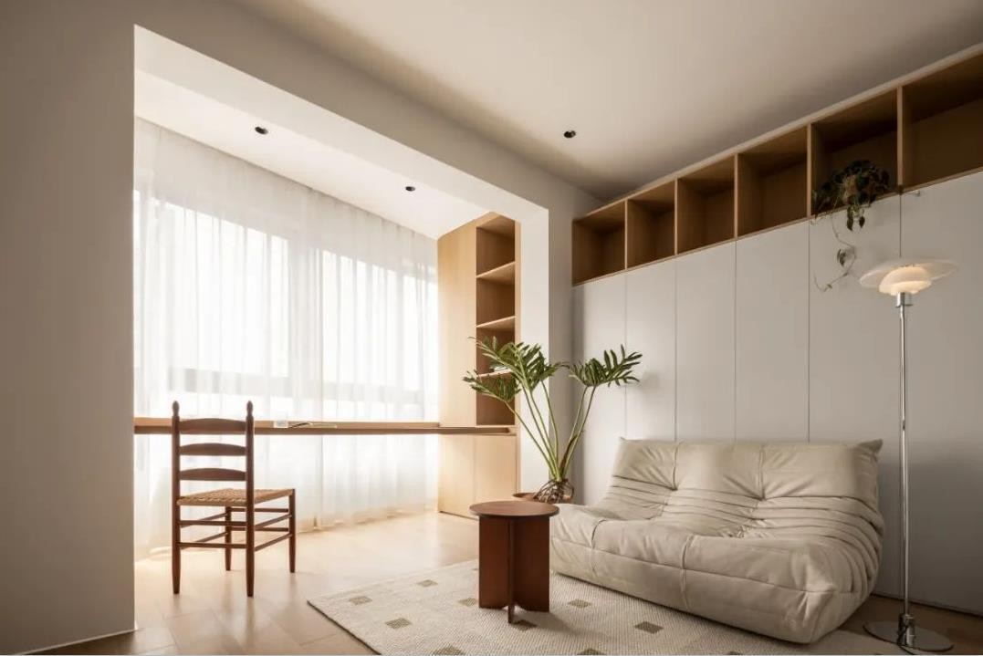 客厅,整体以白色+原木为主,没有做吊顶设计,营造出简单干净的格调感。经典的毛毛虫沙发搭配圆润木质茶几,加上一侧绿植的点缀,如同都市中的小森林。