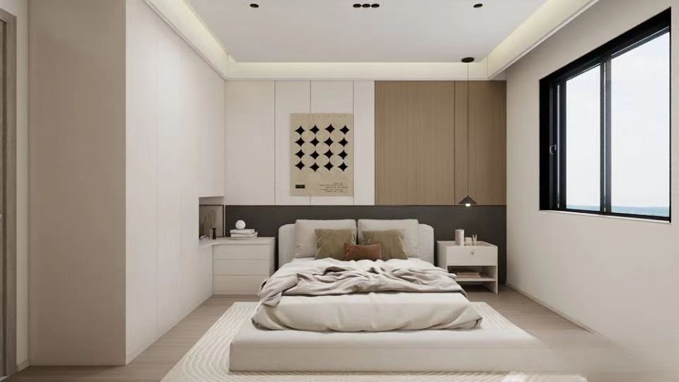 ***化储物空间,床头柜与衣柜相连,整体的色调以灰色为主,再以深色调调整。