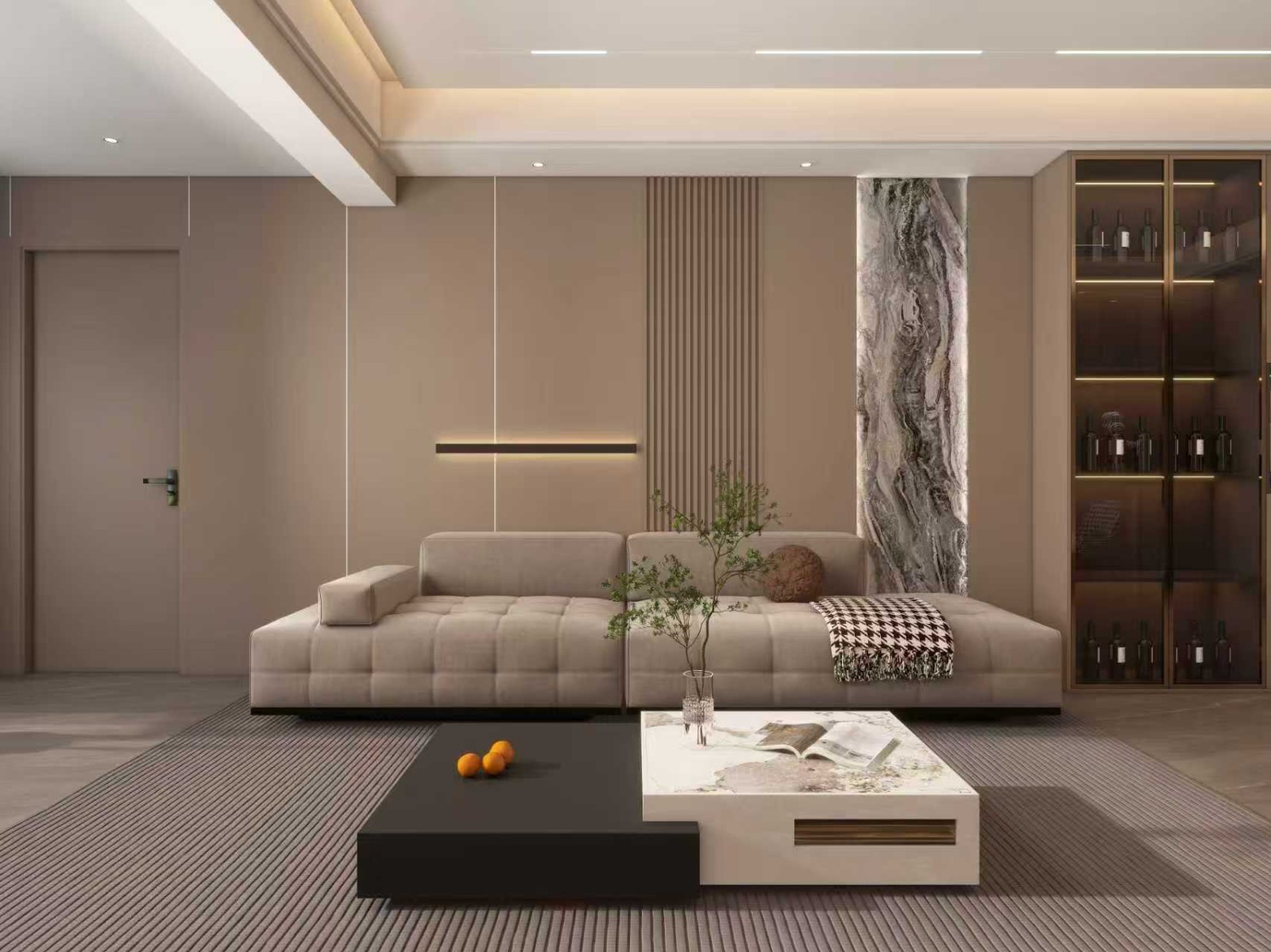 以暖棕为主调,搭配造型独特的茶几、线条简约的沙发,墙面石材与灯光交融,酒柜陈列精致,营造雅致***氛围。