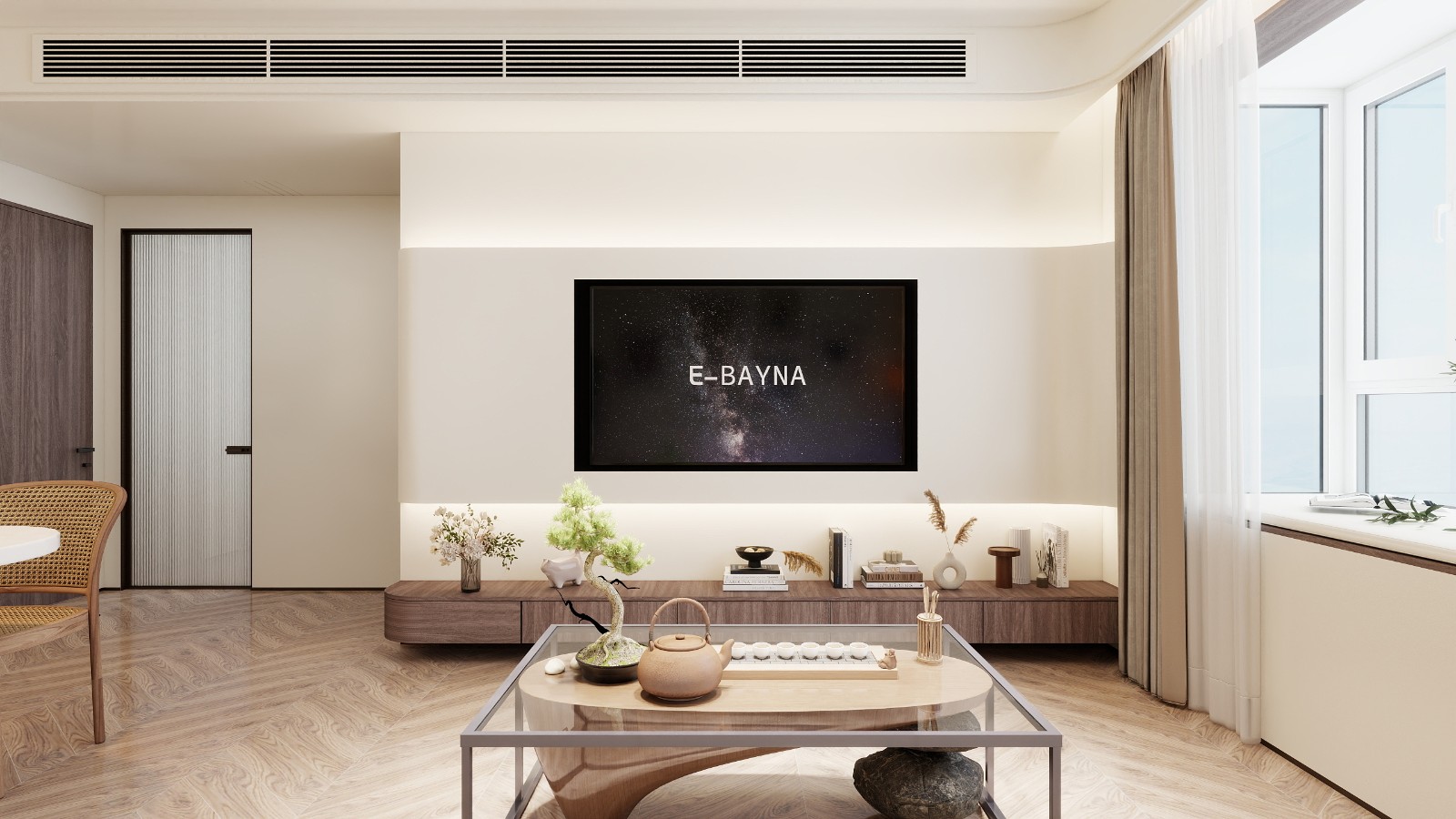 简约原木风为主,悬浮电视柜、玻璃茶几搭配绿植与茶具,营造自然禅意氛围,无主灯设计强化空间通透与温馨感