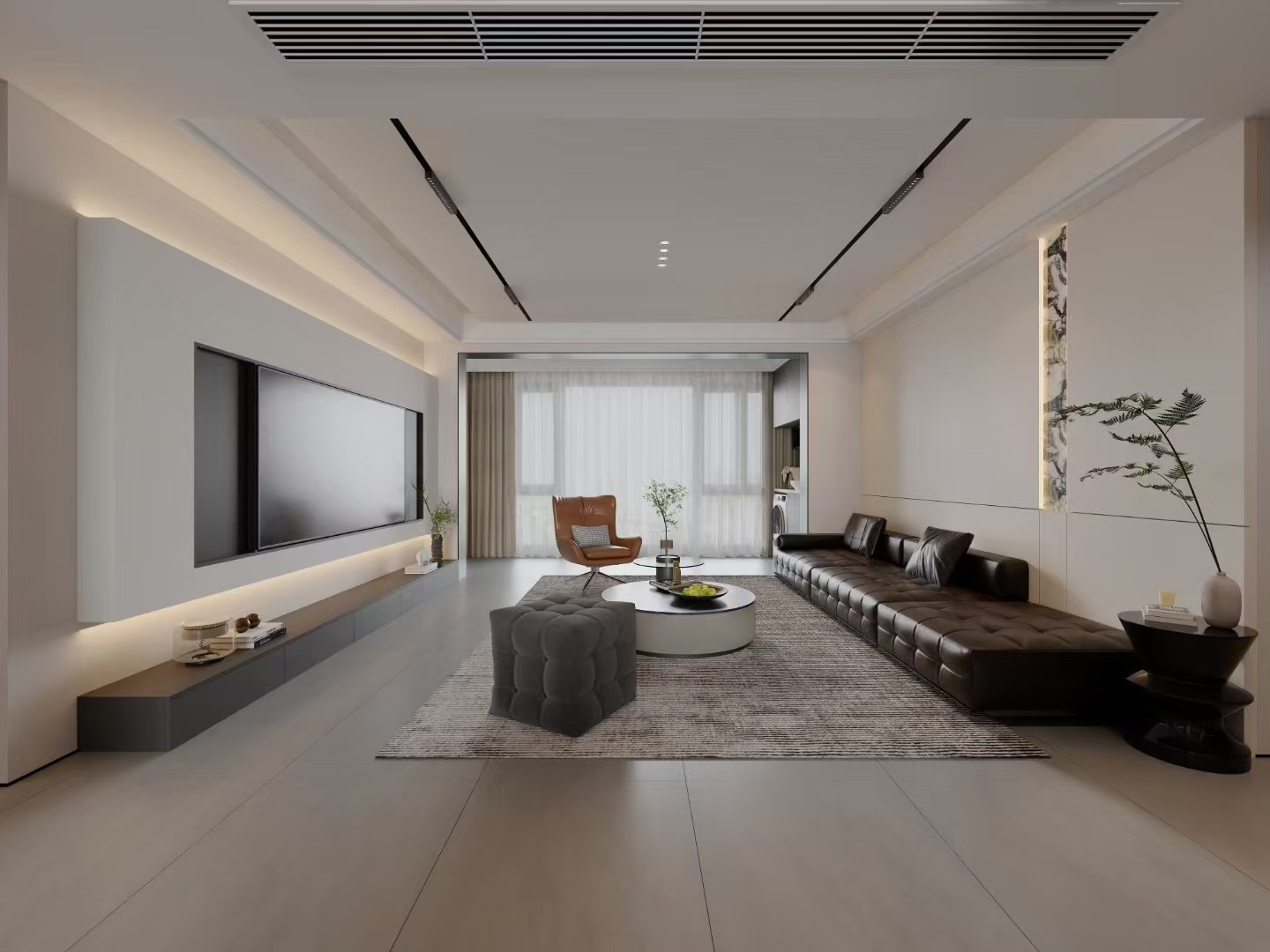 现代简约风格,以简洁的吊顶、流畅线条勾勒开阔感。低饱和色调为主,搭配造型独特的单人椅与简约沙发,地毯划分活动区域,绿植点缀增添生机,让客厅成为休闲、交流的核心舒适区 。