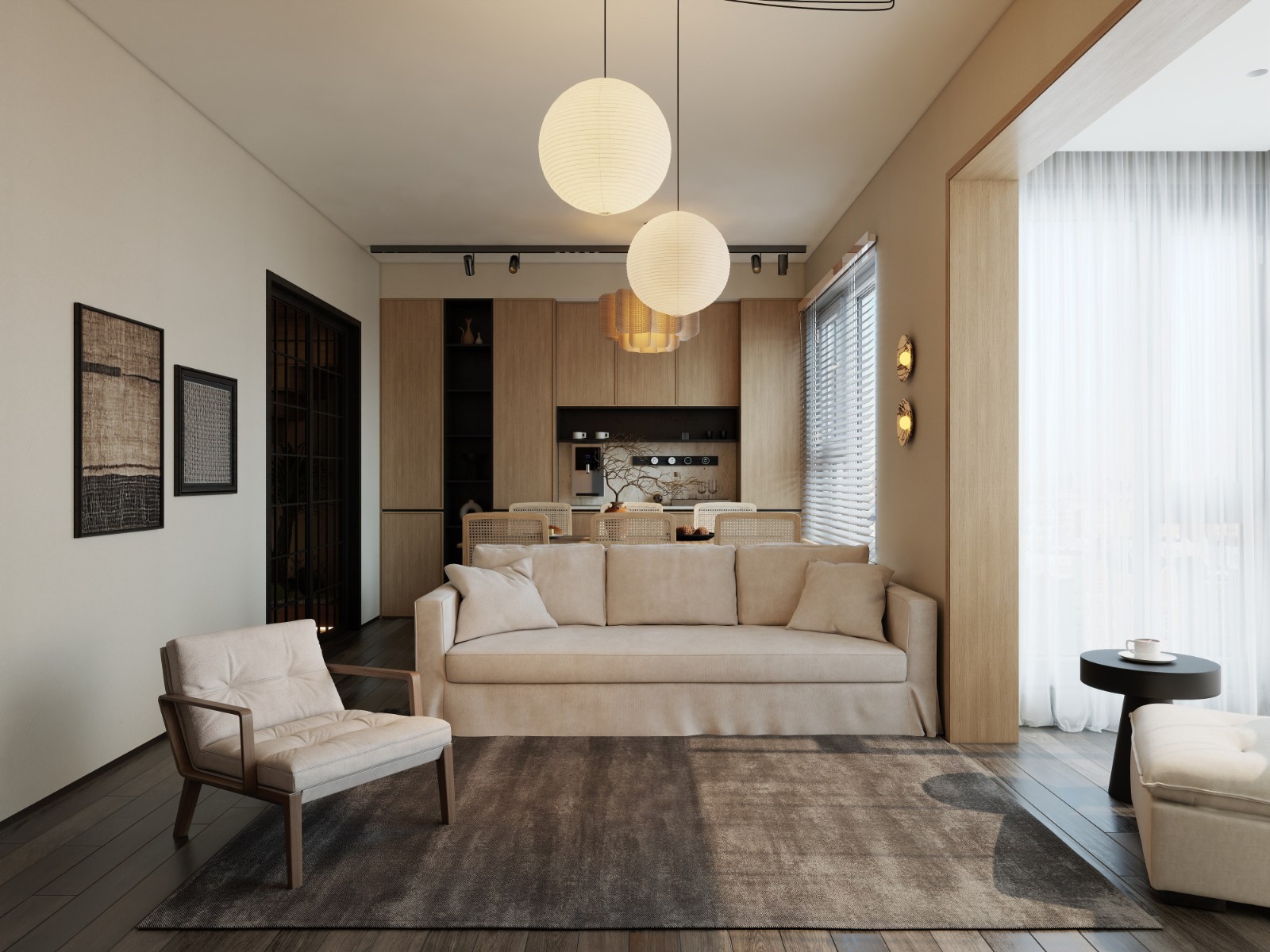 此客厅以柔和米色调为主调,浅棕沙发与单椅尽显质感,球形吊灯优雅垂落,采光***,于简约中流露高雅格调。