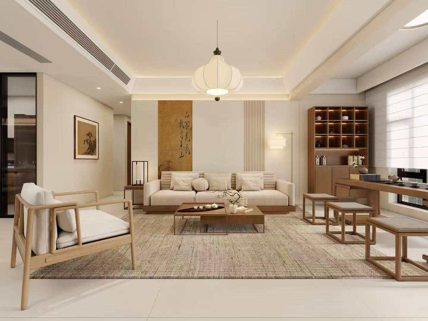 新中式风格主导,浅米墙面衬木艺沙发、圈椅,搭配中式吊灯与书法装饰,以简洁线条勾勒东方美学,营造开阔又具文化底蕴的交流空间。